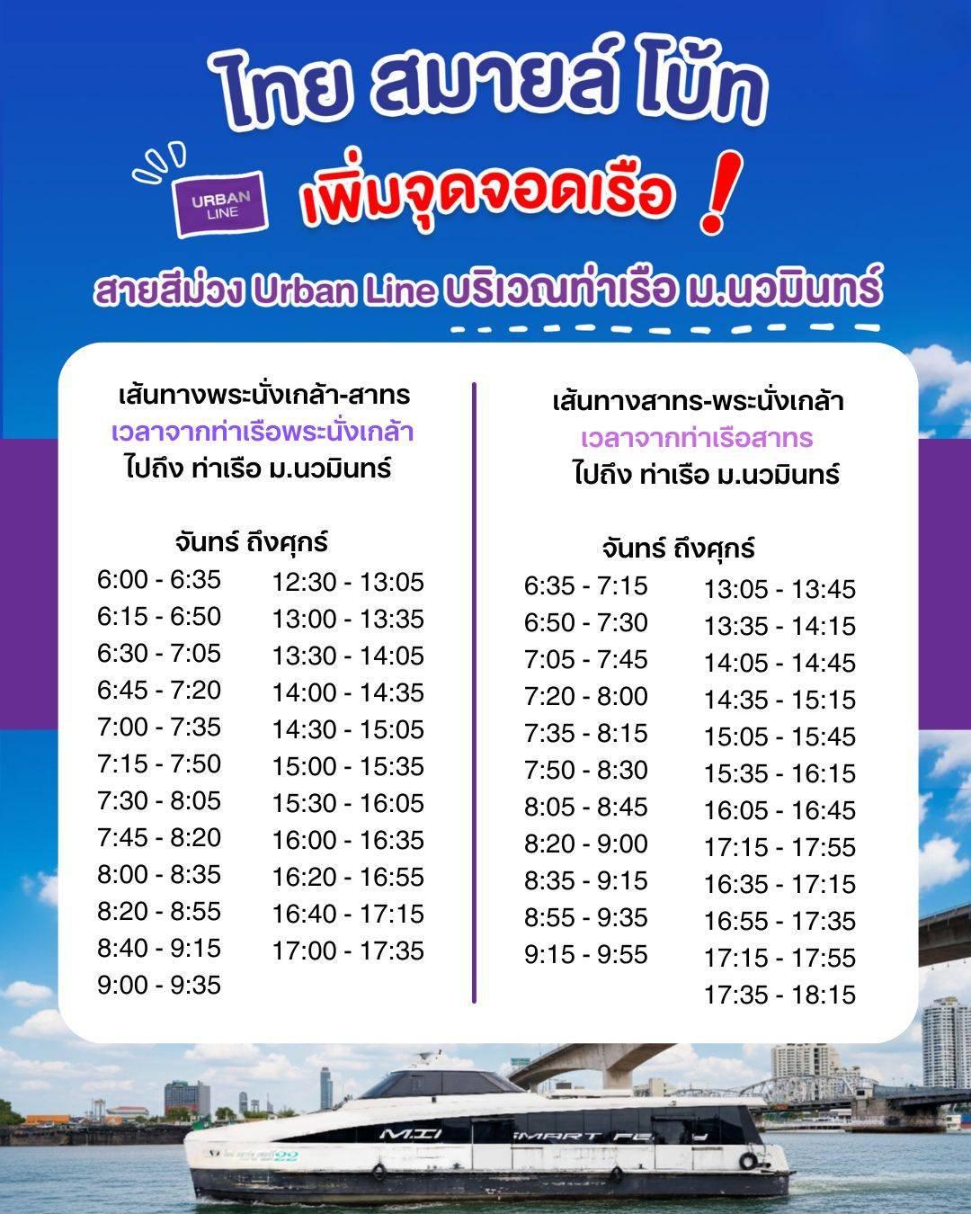 โดยนางสาวกุลพรภัสร์ วงศ์มาจารภิญญา ประธานเจ้าหน้าที่บริหาร กลุ่ม ไทย สมายล์ กรุ๊ป เปิดเผยว่า เพื่อบรรเทาความเดือดร้อนของพี่น้องประชาชน เรือไฟฟ้าของ TSB จะจอดให้บริการเพิ่มเติมในท่าเรือมหาวิทยาลัยนวมินทร์ ตั้งแต่วันที่ 25 ก.ย. 68 เป็นต้นไป โดยเฉพาะในชั่วโมงเร่งด่วน ความถี่ทุก 15 นาที/ลำ ให้บริการตั้งแต่เวลา 06.00 - 17.00 น. ทุกวัน พร้อมจัดเจ้าหน้าที่อำนวยความสะดวกผู้โดยสาร คาดว่าจะสามารถรองรับประชาชนได้หลายพันคนต่อวันจนกว่าสถานการณ์จะคลี่คลาย