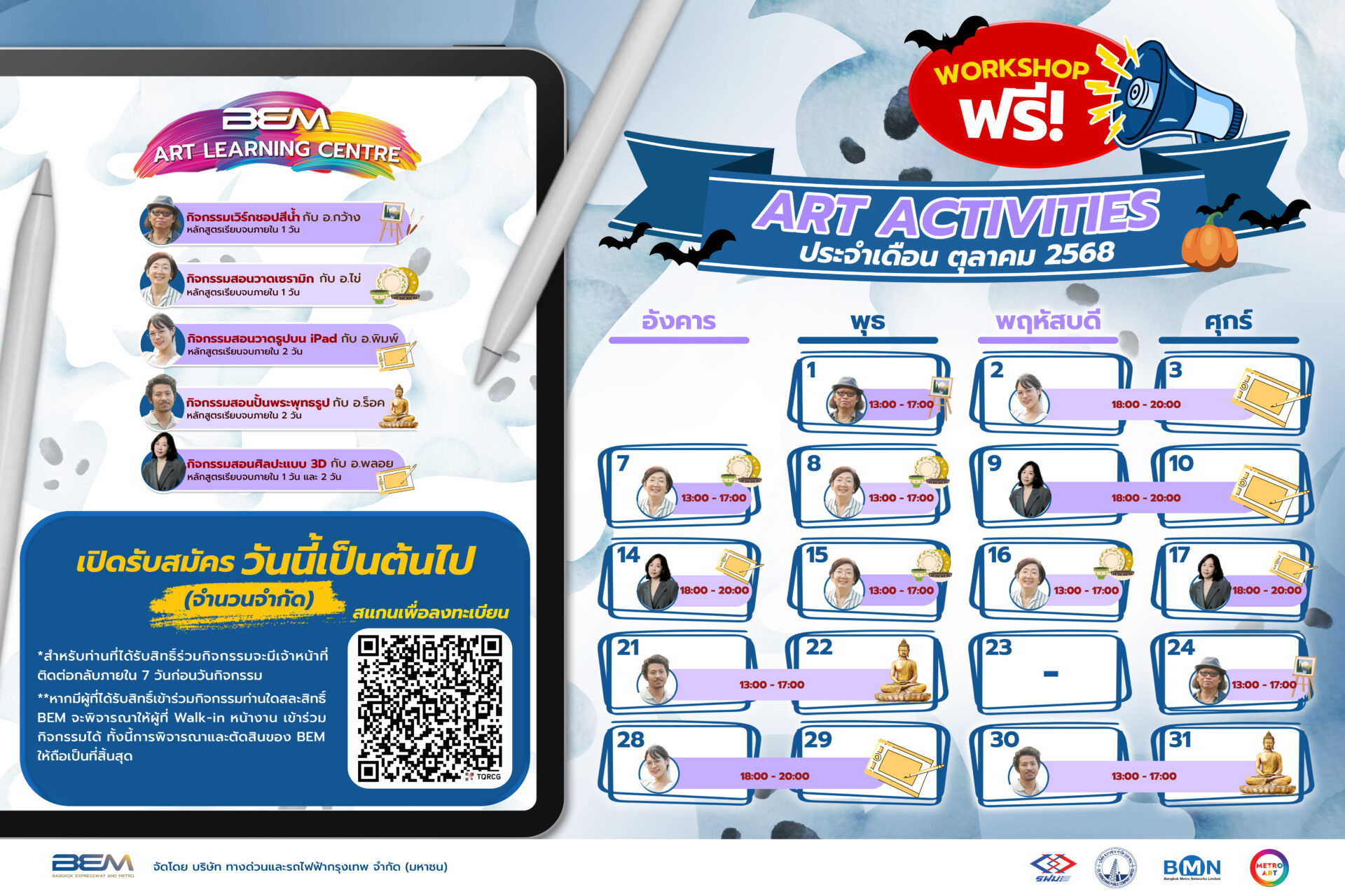 เดือนตุลาคมนี้ มาร่วมปลุกแพสชั่นให้บรรเจิดกับกิจกรรมเวิร์กช้อปสร้างสรรค์ที่มีให้เลือกหลากหลายรูปแบบ จาก บริษัท ทางด่วนและรถไฟฟ้ากรุงเทพ จำกัด (มหาชน) หรือ BEM ที่ Art Learning Centre ณ MRT สถานีพหลโยธิน ได้แก่ เวิร์กช้อปสีน้ำ โดย อ.บุญกว้าง นนท์เจริญ ศิลปินสีน้ำระดับโลก สอนวาดเซรามิก เอาใจสายคราฟท์จาก อ.รัชดา หนองบัว เจ้าของแบรนด์ Vilan by Familyclay สอนปั้นพระพุทธรูป โดย อ.ตะวัน สิโยพุทธวงศ์ ศิลปินผู้เชี่ยวชาญงานประติมากรรม และกิจกรรมยามเย็นฮีลใจที่เปิดให้ได้แวะเข้าร่วมกันก่อนกลับบ้านกับ การสอนวาดรูปบน iPad โดย อ.สาริน ปิติบัณฑิต เจ้าของแฟนเพจ Melt the moment และพิเศษเดือนนี้ยังมีคอร์สสอนศิลปะแบบ 3D จาก อ.พลอยฉัตร ถิรมงคล วิทยากรพิเศษ เพื่อออกแบบหลักสูตรการสอนและสอนศิลปะแบบ 3D สำหรับเด็กและบุคคลผู้สนใจทั่วไปประจำโรงเรียน RightCG โดยผู้ที่สนใจเข้าร่วมทั้งสองคลาสเตรียม iPad มาเอง