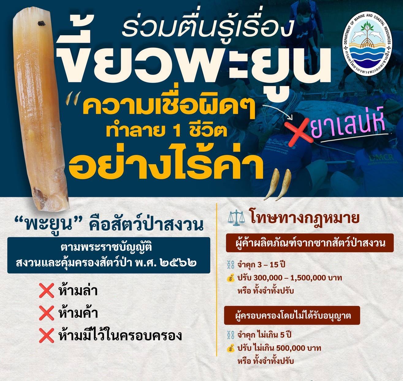 ดร.ปิ่นสักก์ สุรัสวดี อธิบดีกรมทรัพยากรทางทะเลและชายฝั่ง กล่าวว่า กรมฯ ได้หารือร่วมกับกองบังคับการปราบปรามการกระทำผิดเกี่ยวกับทรัพยากรธรรมชาติและสิ่งแวดล้อม (บก.ปทส.) เกี่ยวกับแผนงานโครงการในการป้องกันปราบปรามการตัดเขี้ยวพะยูน พร้อมดำเนินการในมาตรการเชิงรุกแบบบูรณาการ ทั้งภาครัฐ เอกชน และชุมชน ผ่านแนวทางสำคัญ ได้แก่ การเฝ้าระวังและป้องกัน จัดตั้งทีมลาดตระเวนในแหล่งหญ้าทะเล ใช้เทคโนโลยีโดรนและระบบ citizen science ในการติดตามพะยูน และพิจารณาประกาศเขตคุ้มครองใหม่ การช่วยเหลือฉุกเฉิน โดยตั้งทีมกู้ชีพสัตว์ทะเล พร้อมสัตวแพทย์ประจำในโรงพยาบาลสัตว์ทะเลหายาก (ภูเก็ต/ตรัง) การป้องกันการล่า และลักลอบ ดำเนินการสืบสวนร่วมกับกรมอุทยานฯ และตำรวจในพื้นที่ โดยบังคับใช้กฎหมายตามพระราชบัญญัติสงวนและคุ้มครองสัตว์ป่า พ.ศ. 2562 ซึ่งกำหนดโทษสูงสุดจำคุก 15 ปี หรือปรับ 1.5 ล้านบาท นอกจากนี้ ยังได้พัฒนาศักยภาพเจ้าหน้าที่ในการจัดโครงการอบรมเชิงปฏิบัติการการวินิจฉัยและการเก็บข้อมูลตามหลักนิติวิทยาศาสตร์ รวมถึงการฟื้นฟูถิ่นอาศัย เพาะพันธุ์หญ้าทะเลในบ่อกุ้งร้าง กั้นคอกฟื้นฟูหญ้า ฟื้นฟูแหล่งหญ้าทะเลเสื่อมโทรม และสร้างการมีส่วนร่วม จัดอบรมเครือข่ายชาวประมง อาสาสมัครช่วยพะยูน พร้อมรณรงค์สื่อสารให้สังคมรู้คุณค่าของพะยูน ลบล้างความเชื่อผิด ๆ ที่เชื่อว่า “เขี้ยวพะยูนเป็นของขลัง”