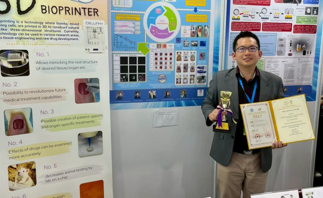 อีกหนึ่งผลงานมีชื่อว่า “Artificial Skin by Bioprinting from Fish Gelatin” เป็นการพัฒนาผิวหนังเทียมโดยใช้เจลาตินที่สกัดจากหนังปลา ซึ่งผ่านการดัดแปลงทางเคมีเพื่อใช้เป็นโครงสร้างสำหรับปลูกเลี้ยงเซลล์มนุษย์ โดยอาศัยแนวคิดทางวิศวกรรมเนื้อเยื่อเพื่อทดแทนผิวหนังที่บาดเจ็บรุนแรง เช่น แผลไฟไหม้ โครงสร้างผิวหนังนี้ประกอบด้วย 3 ส่วนสำคัญ : วัสดุเจลาตินจากหนังปลา เซลล์มนุษย์ที่เพาะลงในโครงสร้าง และระบบกระตุ้นเพื่อเร่งการฟื้นฟู เราทดสอบในสัตว์ทดลองและพบว่าแผลที่ใช้ผิวหนังเทียมฟื้นตัวได้เร็วกว่าแผลปกติ ภายใน 2 สัปดาห์ จุดเด่นของงานนี้คือ การใช้วัตถุดิบจากธรรมชาติที่มีอยู่มากในประเทศ มาพัฒนาเป็นวัสดุทางการแพทย์ที่มีศักยภาพสูง ลดการพึ่งพาวัตถุดิบนำเข้า และสามารถต่อยอดในงานซ่อมแซมเนื้อเยื่อในอนาคตได้” รองศาสตราจารย์ ดร.ณัฐพล กล่าว
