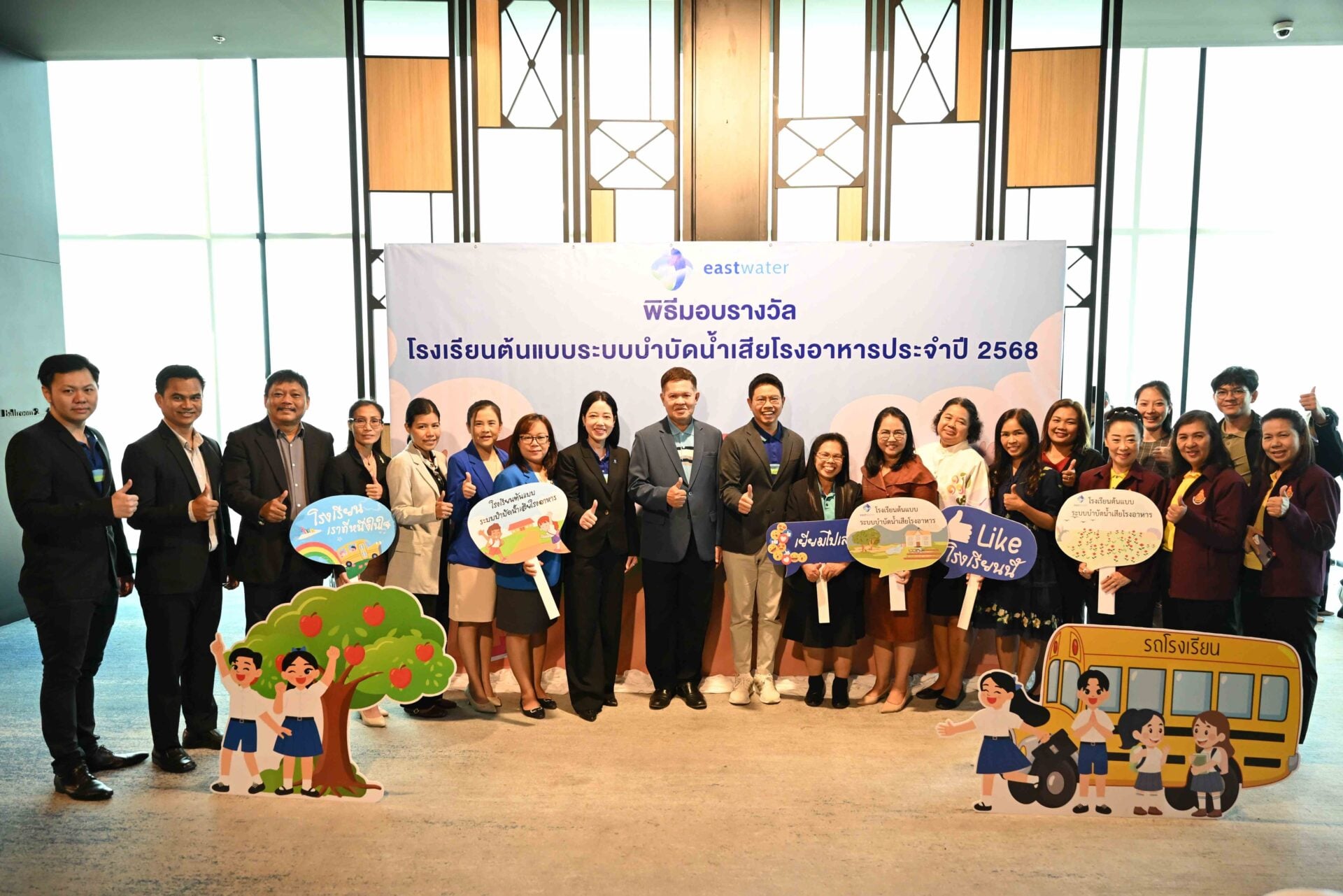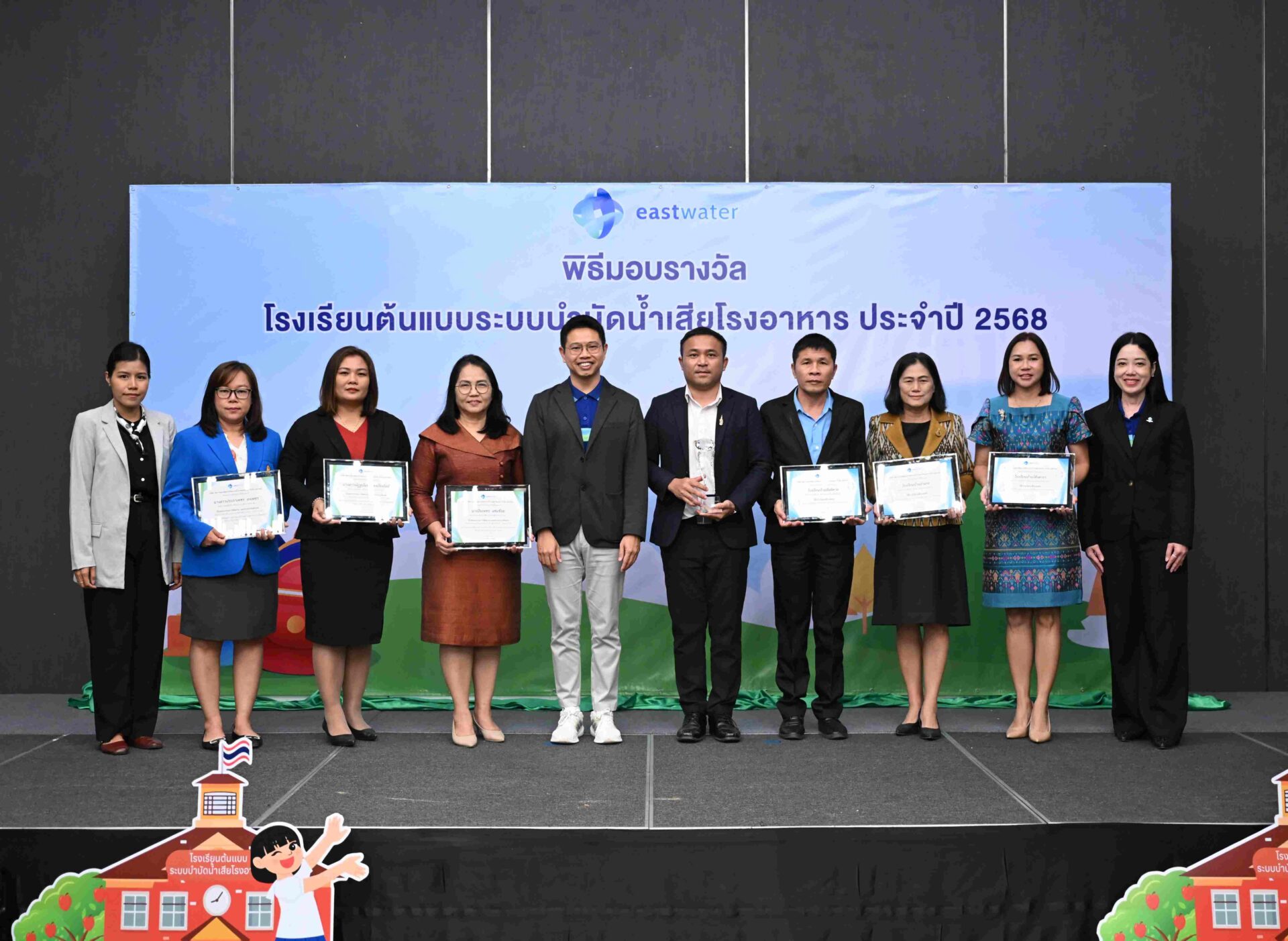 บริษัท จัดการและพัฒนาทรัพยากรน้ำภาคตะวันออก จำกัด (มหาชน) หรือ อีสท์ วอเตอร์ จัดพิธีมอบรางวัล “โครงการโรงเรียนต้นแบบระบบบำบัดน้ำเสียโรงอาหาร” ประจำปี 2568 ณ โรงแรม Holiday Inn & Suites Siracha Laem Chabang อ.ศรีราชา จ.ชลบุรี โดยมี คุณประจักษ์ อมรกุล ผู้ช่วยกรรมการผู้อำนวยการใหญ่ สายกลยุทธ์ เป็นประธานในพิธี พร้อมด้วย ผู้บริหารสำนักงานเขตพื้นที่การศึกษาประถมศึกษาทั้ง 7 เขต ในจังหวัดระยอง ชลบุรี และฉะเชิงเทรา ร่วมแสดงความยินดีแก่โรงเรียนต้นแบบทั้ง 28 แห่ง ที่ได้รับรางวัลในปีนี้