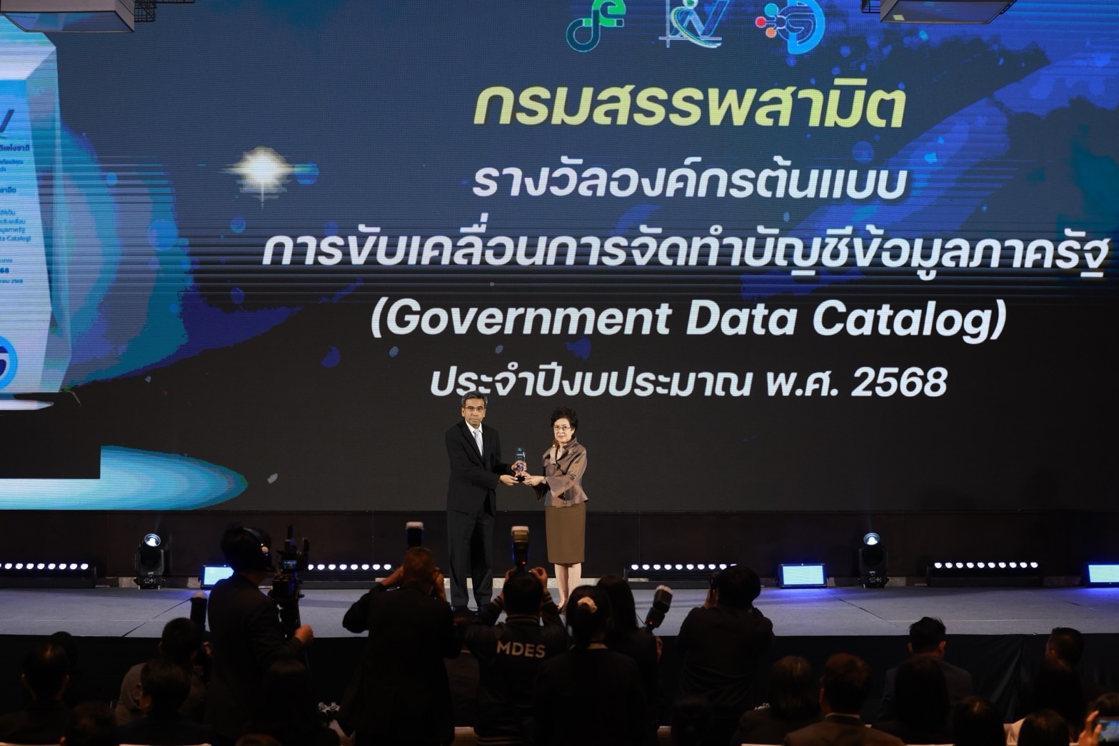 นางจีราวรรณ บุญเพิ่ม ที่ปรึกษารัฐมนตรีว่าการกระทรวงดิจิทัลเพื่อเศรษฐกิจและสังคม ให้ได้เกียรติเป็นประธานในพิธีเปิดงาน พร้อมทั้งมอบรางวัล “GD Catalog Award 2568” แก่หน่วยงานที่มีผลการดำเนินงานโดดเด่นในการขับเคลื่อนการจัดทำบัญชีข้อมูลภาครัฐ รวม 29 รางวัล แบ่งเป็น ระดับกรม 16 รางวัล ระดับจังหวัด 11 รางวัล และหน่วยงานรูปแบบพิเศษและหน่วยงานท้องถิ่น 2 รางวัล โดยได้กล่าวเน้นยำถึงความสำคัญของระบบบัญชีข้อมูลภาครัฐ ว่าเป็นแพลตฟอร์มหลักในการรวบรวมรายชื่อข้อมูลและคำอธิบายข้อมูล (Metadata) ของภาครัฐ เพื่อให้เราทราบว่า ข้อมูลภาครัฐมีอะไร อยู่ที่ไหน และเข้าถึงข้อมูลได้ตามสิทธิ์ที่เจ้าของข้อมูลกำหนดเพื่อนำข้อมูลไปวิเคราะห์และใช้ประโยชน์เชิงนโยบายได้ผ่านช่องทางดิจิทัล และยังเป็นเครื่องมือสำคัญในการบริหารจัดการข้อมูลภาครัฐตั้งแต่ต้นทางภายใต้มาตรฐานเดียวกัน ทั้งการจัดทำ Metadata การจัดระดับชั้นข้อมูลเพื่อกำหนดการเข้าถึงข้อมูลและการจัดเก็บอย่างปลอดภัยตามนโยบาย Could First Policy