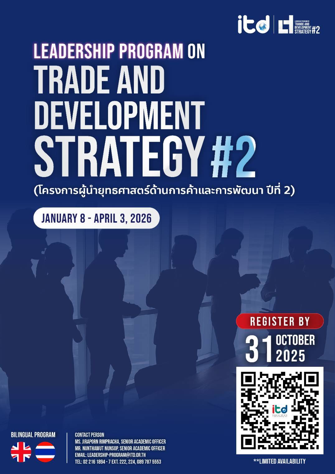 สถาบันระหว่างประเทศเพื่อการค้าและการพัฒนา (องค์การมหาชน) ประกาศเปิดรับสมัครผู้เข้าร่วมโครงการ "ผู้นำยุทธศาสตร์ด้านการค้าและการพัฒนา ปีที่ 2" เพื่อเตรียมผู้นำรุ่นใหม่ให้พร้อมรับมือกับความท้าทายของการค้าโลก