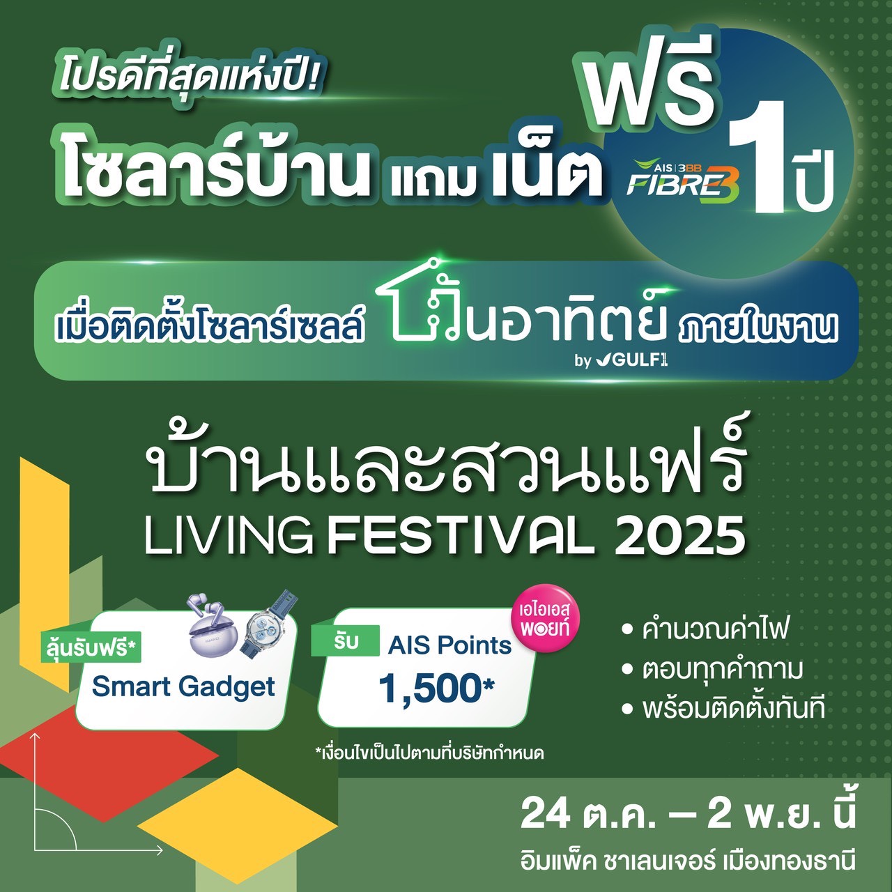 เชิญผู้สนใจแวะมาที่บูธ “วันอาทิตย์” by GULF1 ในงานบ้านและสวนแฟร์ฯ ได้ตั้งแต่วันนี้ – 2 พฤศจิกายน 2568 ณ อิมแพ็ค ชาเลนเจอร์ เมืองทองธานี ทีมงานผู้เชี่ยวชาญพร้อมให้คำปรึกษา ช่วยคำนวณขนาดการติดตั้ง หรือออกแบบ 3D เบื้องต้นฟรี เพื่อประเมินความคุ้มค่าและเลือกโซลูชันที่เหมาะสมกับการใช้งาน พร้อมชม “บ้านตัวอย่าง” (Theme House) ที่ผสานเทคโนโลยีระบบโซลาร์เซลล์และอินเทอร์เน็ตความเร็วสูง ตอบโจทย์ทุกไลฟ์สไตล์ได้อย่างลงตัว ภายใต้แนวคิด Smart Energy, Smart Living, Smart Well-being