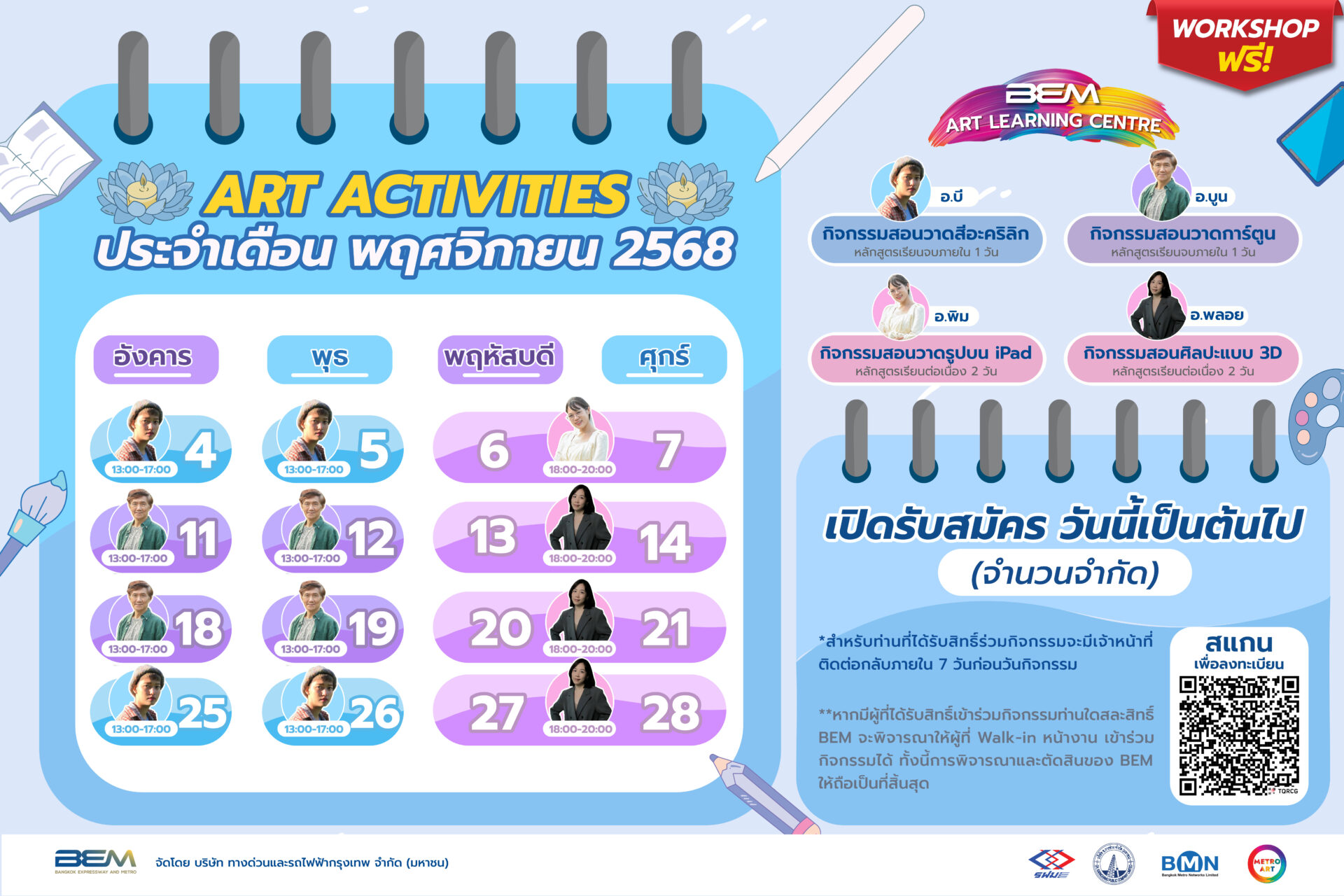 บริษัท ทางด่วนและรถไฟฟ้ากรุงเทพ จำกัด (มหาชน) หรือ BEM ชวนคนรักการวาดภาพมาร่วมกิจกรรม Art Activities ประจำเดือนพฤศจิกายน นี้ ที่ Art Learning Centre ณ MRT สถานีพหลโยธิน โดยมีหลากหลายคลาสที่จะพาทุกคนไปสนุกกับการเพิ่มสกิลใหม่ๆ แบบไม่เสียค่าใช้จ่าย ได้แก่ การวาดภาพด้วยสีอะคริลิก โดย อ.บ่ายฟ้า นนท์เจริญ ศิลปินผู้เชี่ยวชาญด้านสีอะคริลิก นักการตลาด และนักคิด คอนเทนต์อิสระ การวาดการ์ตูน โดย อ.สมบุญ เกรียงอารีกุล หรือ BOON ผู้คร่ำหวอดในวงการอนิเมะและนักวาดภาพปกหนังสือการ์ตูนชื่อดัง และกิจกรรมยามเย็นฮีลใจที่เปิดให้ได้แวะเข้าร่วมกันก่อนกลับบ้านกับการวาดรูปบน iPad โดย อ.สาริน ปิติบัณฑิต เจ้าของแฟนเพจ Melt the moment และพิเศษเดือนนี้ยังมีคลาสสอนศิลปะแบบ 3D จาก อ.พลอยฉัตร ถิรมงคล วิทยากรพิเศษ จากโรงเรียน RightCG ที่จะมาเปิดโลกการสร้างสรรค์งานศิลปะ 3D สำหรับเด็กและบุคคลผู้สนใจทั่วไป โดยผู้ที่สนใจเข้าร่วมทั้งสองคลาสเตรียม iPad มาเอง