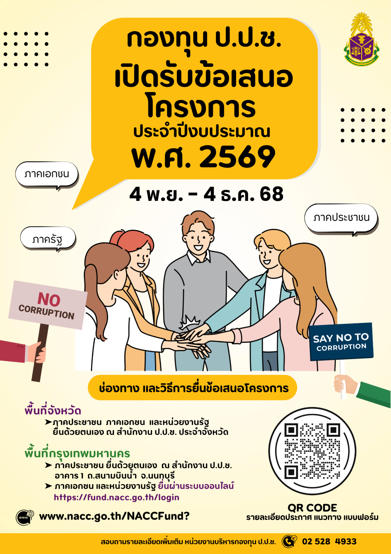 กองทุนป้องกันและปราบปรามการทุจริตแห่งชาติ (กองทุน ป.ป.ช.) กำหนดเปิดรับข้อเสนอโครงการเพื่อขอรับการสนับสนุนเงินจากกองทุน ป.ป.ช. ประจำปีงบประมาณ พ.ศ. 2569 ตามพระราชบัญญัติประกอบรัฐธรรมนูญว่าด้วยการป้องกันและปราบปรามการทุจริต พ.ศ. 2561 มาตรา 162 (1) สนับสนุนการมีส่วนร่วมของประชาชนในการตรวจสอบการใช้อำนาจรัฐ และสนับสนุนภาคเอกชนในการเผยแพร่และประชาสัมพันธ์ หรือรณรงค์ในการป้องกันการทุจริต และ (4) ค่าใช้จ่ายอื่นใดที่จะเป็นประโยชน์ในการปฏิบัติหน้าที่ของหน่วยงานของรัฐที่มีหน้าที่และอำนาจเกี่ยวข้องกับการป้องกันและปราบปรามการทุจริต โดยกำหนดแนวทางการจัดทำข้อเสนอโครงการเพื่อขอรับการสนับสนับสนุนเงินจากกองทุน ป.ป.ช. ดังนี้