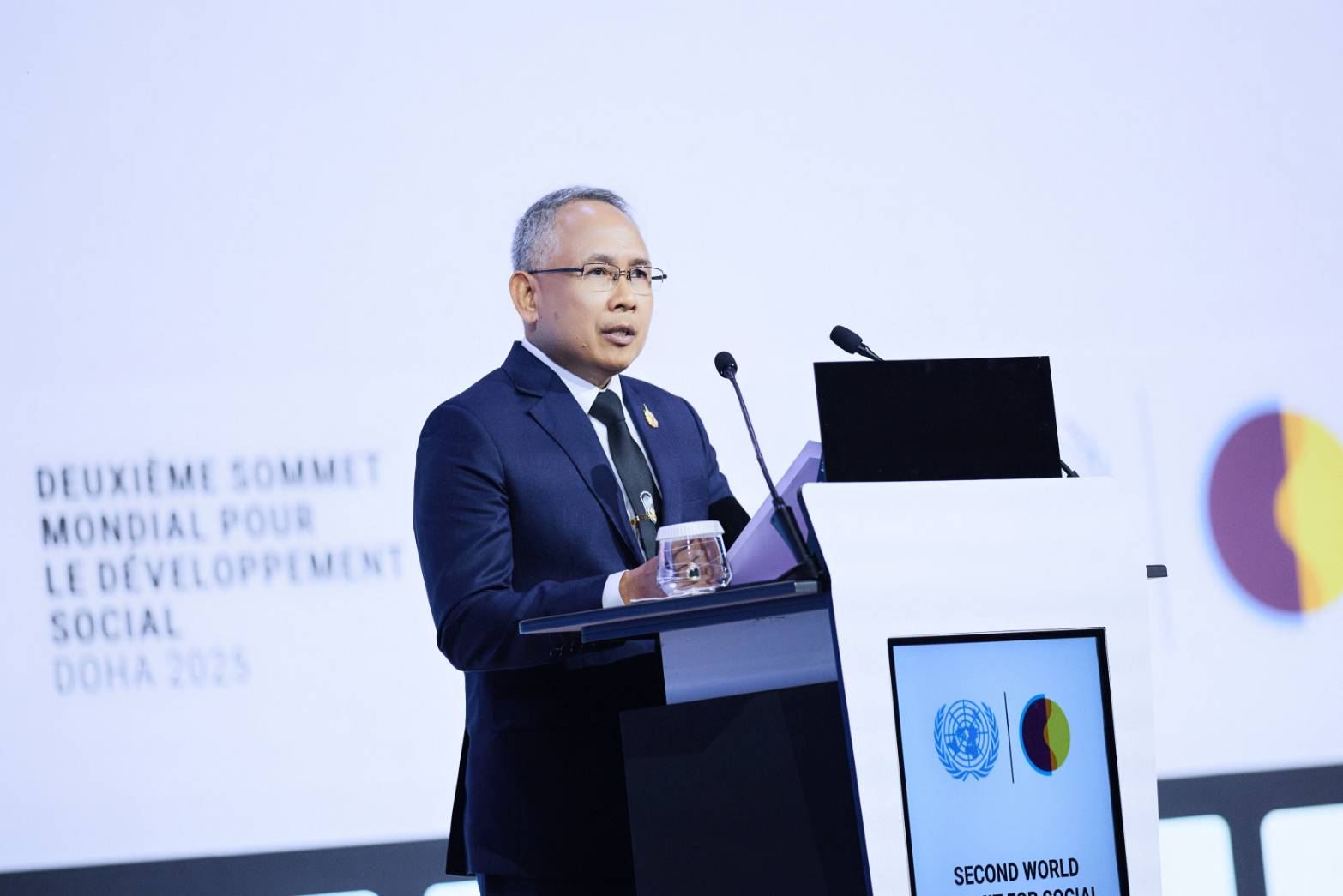 เมื่อเวลา 13.00 น. วันที่ 6 พฤศจิกายน 2568 (ตามเวลาท้องถิ่นกรุงโดฮา (Doha) ซึ่งช้ากว่ากรุงเทพฯ 4 ชั่วโมง) ที่ศูนย์การประชุมแห่งชาติกาตาร์ (The Qatar National Convention Center: QNCC) กรุงโดฮา รัฐกาตาร์ นายอัครา พรหมเผ่า รัฐมนตรีว่าการกระทรวงการพัฒนาสังคมและความมั่นคงของมนุษย์ (รมว.พม.) มอบหมายให้ นายกันตพงศ์ รังษีสว่าง ปลัดกระทรวงการพัฒนาสังคมและความมั่นคงของมนุษย์ (ปลัด พม.) ในฐานะหัวหน้าคณะผู้แทนไทย กล่าวถ้อยแถลงในการประชุมสุดยอดระดับโลกว่าด้วยการพัฒนาสังคม ครั้งที่ 2 (Second World Summit for Social Development) โดยมี นางจตุพร โรจนพานิช อธิบดีกรมกิจการสตรีและสถาบันครอบครัว พร้อมด้วย คณะเจ้าหน้าที่กระทรวงการพัฒนาสังคมและความมั่นคงของมนุษย์ (พม.) กระทรวงการต่างประเทศ และกระทรวงมหาดไทย เข้าร่วมการประชุมฯ