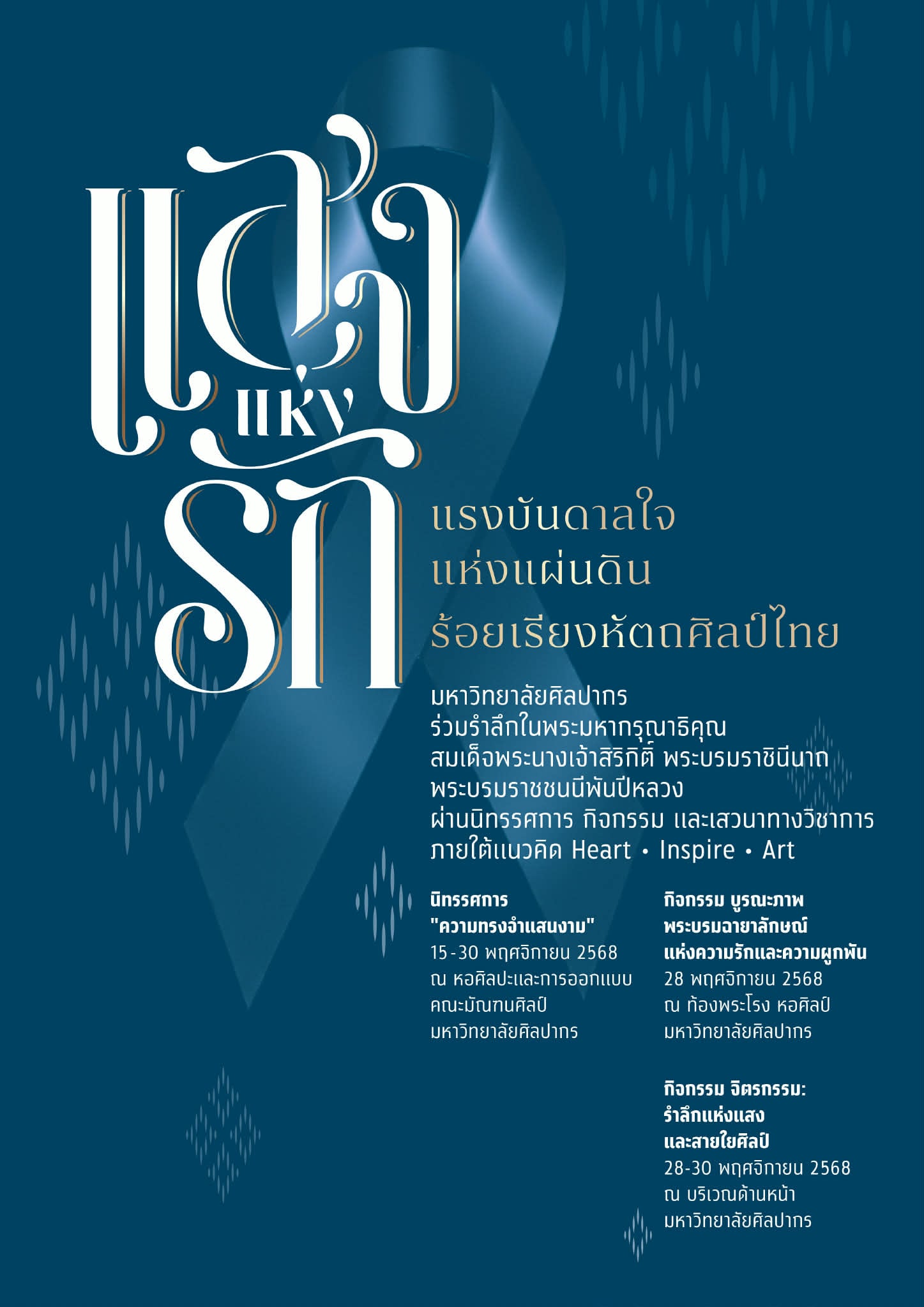 มหาวิทยาลัยศิลปากร เตรียมจัดกิจกรรมน้อมรำลึกและแสดงความอาลัยอย่างสุดซึ้งต่อพระมหากรุณาธิคุณอันหาที่สุดมิได้ของสมเด็จพระนางเจ้าสิริกิติ์ พระบรมราชินีนาถ พระบรมราชชนนีพันปีหลวง ภายใต้แนวคิด “แสงแห่งรัก แรงบันดาลใจแห่งแผ่นดิน ร้อยเรียงหัตถศิลป์ไทย (Heart-Inspire-Craft)” เพื่อสานต่อพระราชปณิธานในการส่งเสริมงานศิลป์และธำรงไว้ซึ่งศิลปะและวัฒนธรรมของชาติ