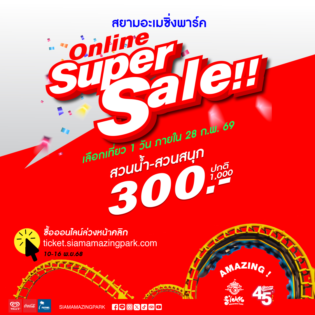 สยามอะเมซิ่งพาร์ค จัดหนักจัดเต็ม โปรโมชั่นพิเศษ Super Sale ในโอกาสครบ 45 ปี เที่ยวได้ทั้งสวนสนุก เครื่องเล่นระดับโลกมากมาย สวนน้ำสุดอลังการ พร้อมเปิดตัวเครื่องเล่นใหม่กลางทะเล-กรุงเทพฯ Ranger’s Pirate Lagoon สนุกไม่อั้นไม่จำกัดรอบทั้งวัน บัตรผู้ใหญ่ ( 130ซม. ขึ้นไป) ในราคาพิเศษเพียง 300 บาท (จากปกติ 1,000 บาท) เลือกเที่ยววันใดก็ได้ภายใน 28 ก.พ. 69 ช่องทางเดียวง่ายๆ ซื้อออนไลน์ที่ ticket.siamamazingpark.com วันนี้ถึง 16 พ.ย. เท่านั้น