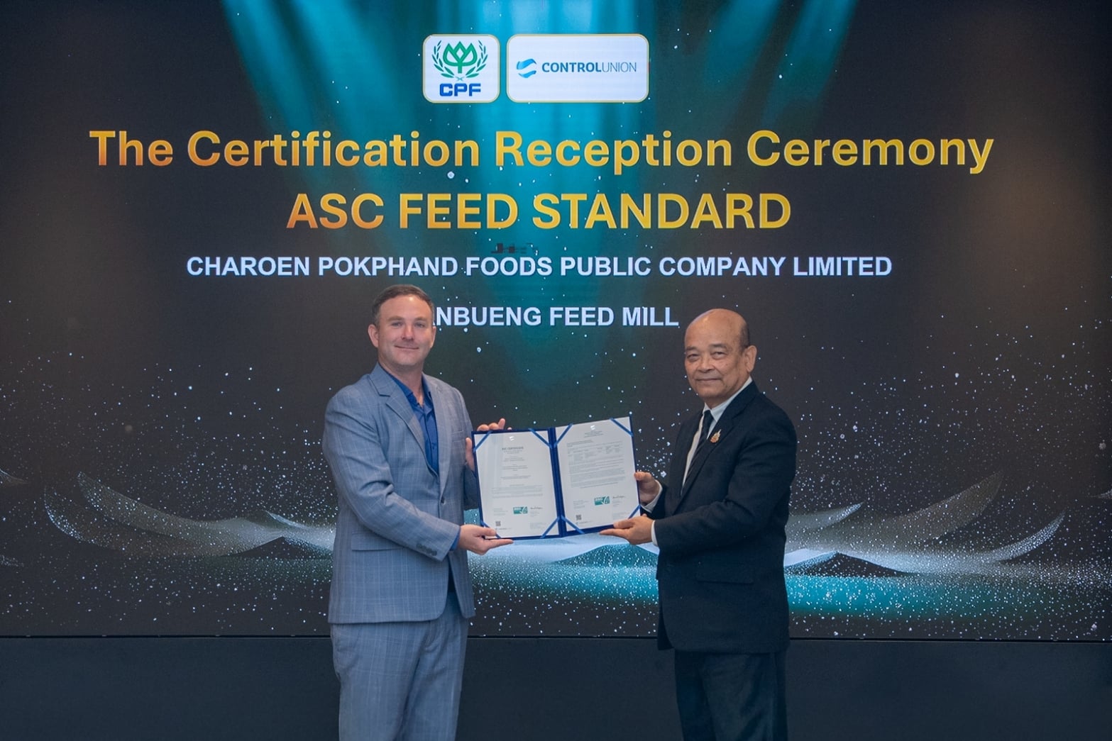 ล่าสุด ธุรกิจสัตว์น้ำ ซีพีเอฟ โดยโรงงานอาหารสัตว์น้ำบ้านบึง ตั้งอยู่ในจังหวัดชลบุรี ได้รับการรับรอง ASC Feed Standard จากองค์กร Aquaculture Stewardship Council หรือ ASC ซึ่งเป็นมาตรฐานสากลที่ลูกค้าและผู้บริโภคทั่วโลกยอมรับว่าเป็นมาตรฐานที่เข้มงวด มีแนวปฏิบัติที่รับผิดชอบและโปร่งใส ครอบคลุมทุกมิติ โดยมี น.สพ.สุจินต์ ธรรมศาสตร์ ประธานผู้บริหารฝ่ายปฏิบัติการธุรกิจสัตว์น้ำ ซีพีเอฟ รับมอบใบรับรองมาตรฐานจาก นายสเตฟาน ฟรองซัว แอล มอริลส กรรมการผู้จัดการ บริษัท คอนโทรล ยูเนี่ยน (ประเทศไทย) จำกัด หน่วยงานรับรองมาตรฐานที่ได้รับอนุมัติจาก ASC