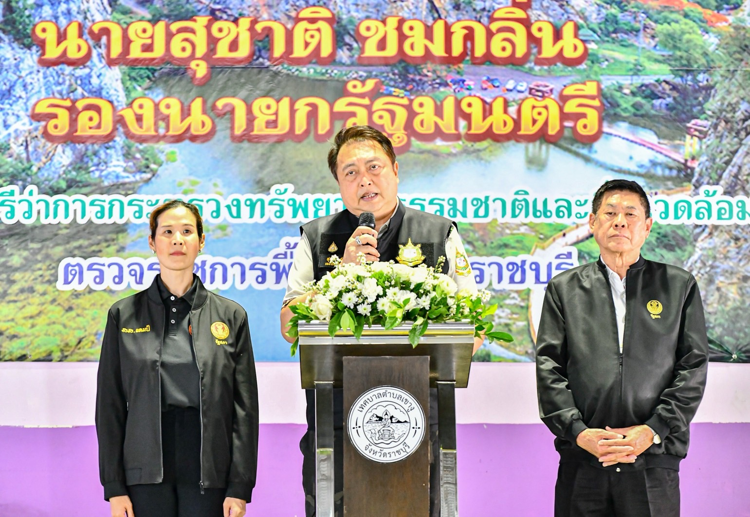 วันนี้ (20 พฤศจิกายน 2568) เวลา 11.00 น. นายสุชาติ ชมกลิ่น รองนายกรัฐมนตรี และรัฐมนตรีว่าการกระทรวงทรัพยากรธรรมชาติและสิ่งแวดล้อม พร้อมคณะผู้บริหารระดับสูงของกระทรวงฯ ลงพื้นที่ติดตามการดำเนินงานด้านทรัพยากรธรรมชาติในพื้นที่จังหวัดราชบุรี โดยมี นางสาววริษฐา สงวนเสริมศรี รองผู้ว่าราชการจังหวัดราชบุรี นายมานิต นพอมรบดี อดีตรัฐมนตรีช่วยว่าการกระทรวงสาธารณสุข นายกองค์การบริหารส่วนจังหวัดราชบุรี คุณกุลวลี นพอมรบดี สมาชิกสภาผู้แทนราษฎรจังหวัดราชบุรี และประชาชนในพื้นที่ ให้การต้อนรับ ณ ศาลาเอนกประสงค์ เทศบาลตำบลเขางู จังหวัดราชบุรี
