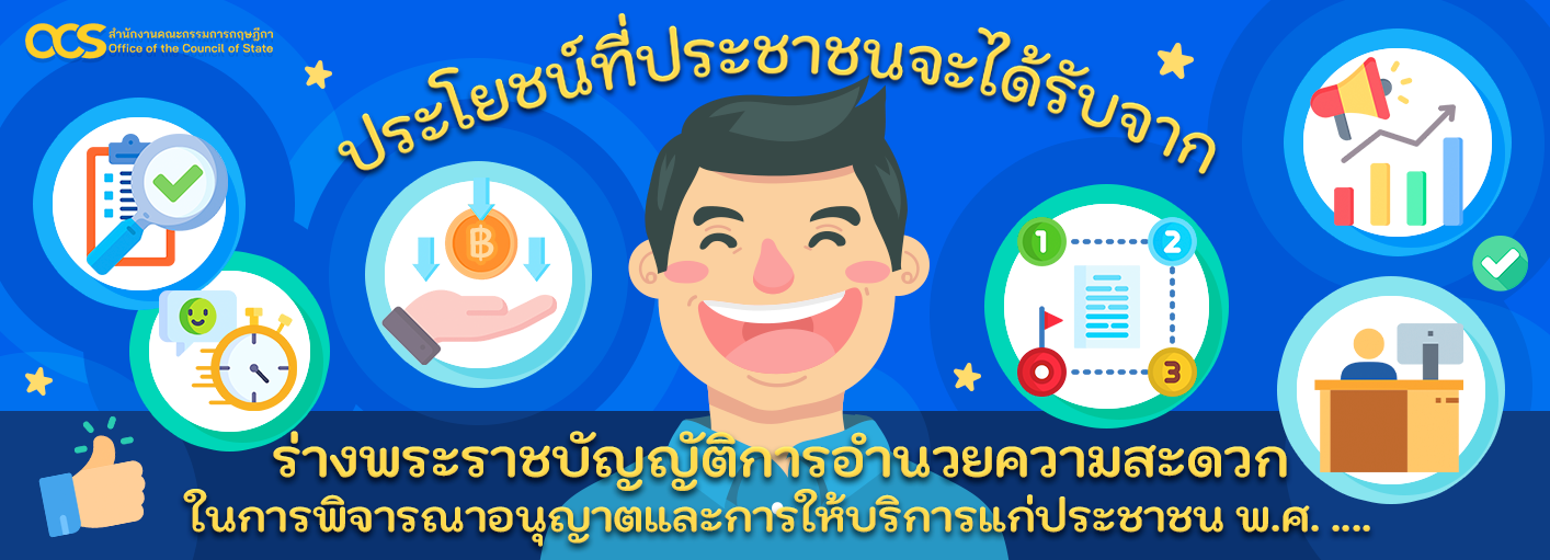 ตามที่สำนักงานคณะกรรมการกฤษฎีกาได้ตรวจพิจารณาร่างพระราชบัญญัติการอำนวยความสะดวกในการพิจารณาอนุญาตและการให้บริการแก่ประชาชน พ.ศ. .... ของสำนักงานคณะกรรมการพัฒนาระบบราชการแล้วเสร็จในปลายปี พ.ศ. ๒๕๖๗ (เรื่องเสร็จที่ ๑๔๗๘/๒๕๖๗) จนกระทั่งร่างพระราชบัญญัติดังกล่าวเข้าสู่กระบวนการพิจารณาของฝ่ายนิติบัญญัติตั้งแต่ต้นปี พ.ศ. ๒๕๖๘ นั้น ปัจจุบันร่างพระราชบัญญัติการอำนวยความสะดวกในการพิจารณาอนุญาตและการให้บริการแก่ประชาชน พ.ศ. .... ใกล้ที่จะผ่านการพิจารณาของรัฐสภา และประกาศใช้บังคับเป็นของขวัญแก่ประชาชนในปี พ.ศ. ๒๕๖๙ ตามวัตถุประสงค์ในการพัฒนาและขยายมาตรการอำนวยความสะดวกแก่ประชาชนในการติดต่อกับราชการและหน่วยงานของรัฐต่อไป ในการนี้ สำนักงานคณะกรรมการกฤษฎีกาจึงขอสรุปประโยชน์ที่ประชาชนจะได้รับจากร่างพระราชบัญญัติดังกล่าว ดังต่อไปนี้