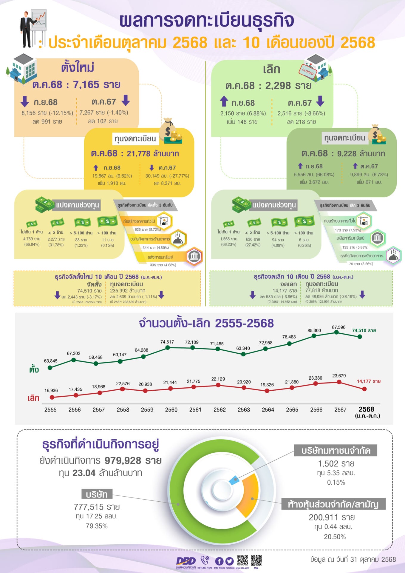กรมพัฒนาธุรกิจการค้า เผยเดือนตุลาคม 2568 มีธุรกิจจัดตั้งใหม่ 7,165 ราย ทุนจดทะเบียนรวม 21,778 ล้านบาท แม้ทุนจดทะเบียนจะลดลงจากปีก่อน แต่ทุนเพิ่มขึ้นเมื่อเทียบกับเดือน ก.ย. 68 ขณะที่ 10 เดือนปี 2568 มีธุรกิจจัดตั้งใหม่รวม 74,510 ราย ทุนจดทะเบียนรวม 2.35 แสนล้านบาท ส่วนการลงทุนของต่างชาติ 10 เดือนปี 68 ยังขยายตัวต่อเนื่อง มีจำนวน 869 ราย เงินลงทุนรวม 276,736 ล้านบาท เพิ่มขึ้นทั้งจำนวนราย 11% และมูลค่าการลงทุน 72% เมื่อเทียบกับช่วงเวลาเดียวกันของปี 2567 โดยญี่ปุ่น สหรัฐอเมริกา และสิงคโปร์ ยังคงติดอันดับ 3 ประเทศที่เข้ามาลงทุนในประเทศไทยอย่างต่อเนื่อง