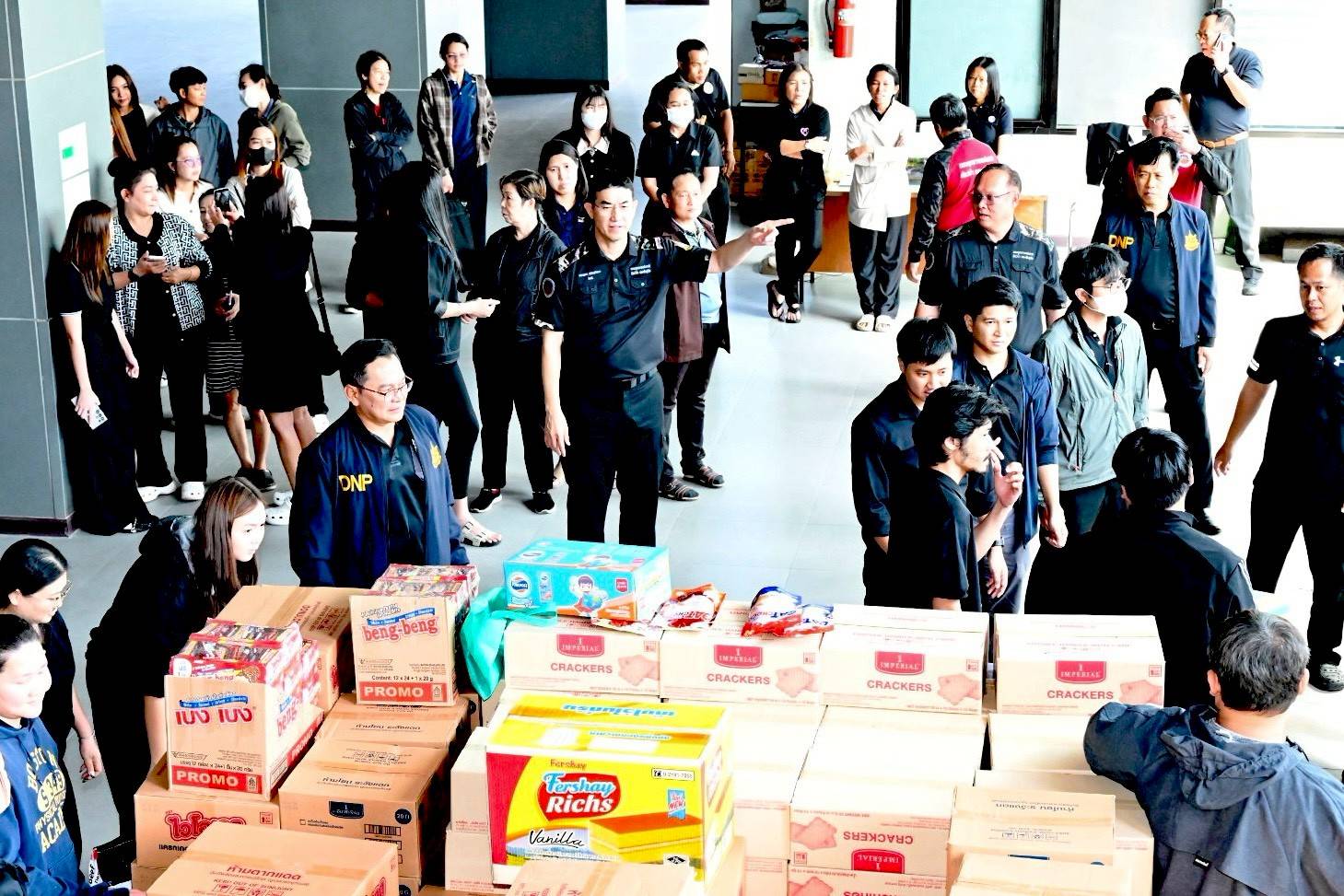 การขนส่งสิ่งของได้ดำเนินการทั้งทางบกและทางอากาศ โดยรถบรรทุก 6 ล้อจากศูนย์ปฏิบัติการไฟป่าในพื้นที่ฉะเชิงเทรา กาญจนบุรี อุทัยธานี และนครราชสีมา รวม 4 คัน ใช้ลำเลียงสิ่งของที่มีน้ำหนักมาก ได้แก่ เครื่องดื่ม เช่น นม 33 ลัง รวม 1,021 กล่อง และน้ำดื่ม 140 แพ็ค รวมถึงอาหารจำเป็นต่าง ๆ เช่น ปลากระป๋อง 1,190 กระป๋อง ผักกาดดอง 42 กระป๋อง ข้าวสาร 115 ถุง น้ำพริก ขนมหลายชนิด บะหมี่กึ่งสำเร็จรูป 183 ลังเล็ก บะหมี่ถ้วย 15 ลัง รวมทั้งโจ๊กและของใช้จำเป็น อาทิ ยาสีฟัน สบู่ แปรงสีฟัน แชมพู คอตตอนบัด น้ำยาทำความสะอาด ทิชชู่ ผ้าอนามัย แพมเพิสผู้ใหญ่ เทียน ตลอดจนเสื้อผ้า ผ้าห่ม และรองเท้าลำลอง นอกจากนี้ ยังมีเวชภัณฑ์และยาสามัญประจำบ้าน รวมถึงอาหารสัตว์ เช่น อาหารสุนัข 3 กระสอบ และอาหารแมว 4 กระสอบ