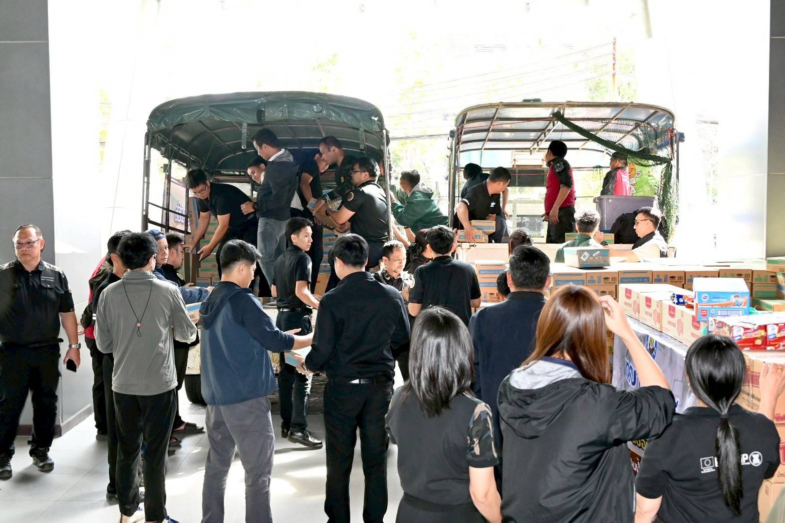 การขนส่งสิ่งของได้ดำเนินการทั้งทางบกและทางอากาศ โดยรถบรรทุก 6 ล้อจากศูนย์ปฏิบัติการไฟป่าในพื้นที่ฉะเชิงเทรา กาญจนบุรี อุทัยธานี และนครราชสีมา รวม 4 คัน ใช้ลำเลียงสิ่งของที่มีน้ำหนักมาก ได้แก่ เครื่องดื่ม เช่น นม 33 ลัง รวม 1,021 กล่อง และน้ำดื่ม 140 แพ็ค รวมถึงอาหารจำเป็นต่าง ๆ เช่น ปลากระป๋อง 1,190 กระป๋อง ผักกาดดอง 42 กระป๋อง ข้าวสาร 115 ถุง น้ำพริก ขนมหลายชนิด บะหมี่กึ่งสำเร็จรูป 183 ลังเล็ก บะหมี่ถ้วย 15 ลัง รวมทั้งโจ๊กและของใช้จำเป็น อาทิ ยาสีฟัน สบู่ แปรงสีฟัน แชมพู คอตตอนบัด น้ำยาทำความสะอาด ทิชชู่ ผ้าอนามัย แพมเพิสผู้ใหญ่ เทียน ตลอดจนเสื้อผ้า ผ้าห่ม และรองเท้าลำลอง นอกจากนี้ ยังมีเวชภัณฑ์และยาสามัญประจำบ้าน รวมถึงอาหารสัตว์ เช่น อาหารสุนัข 3 กระสอบ และอาหารแมว 4 กระสอบ