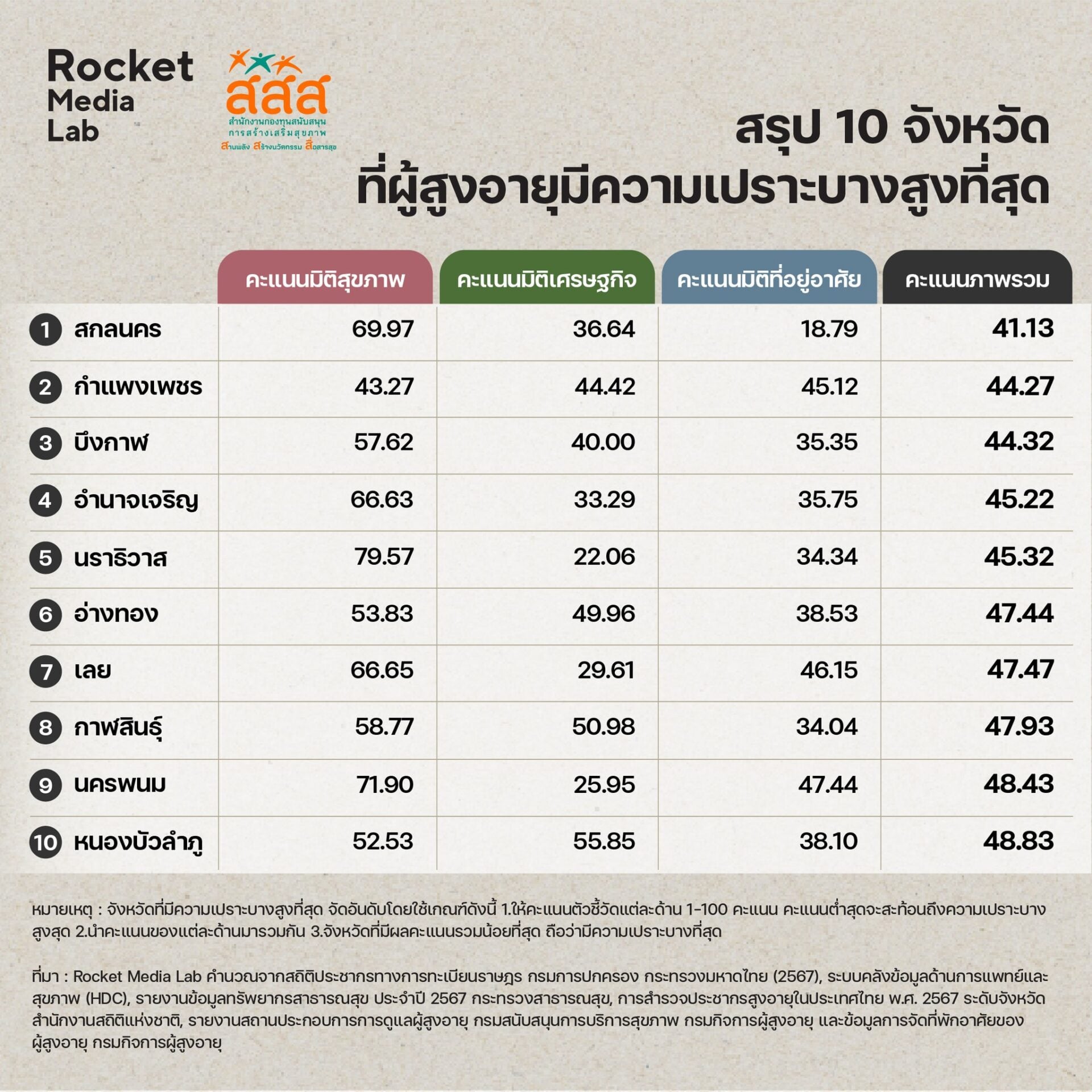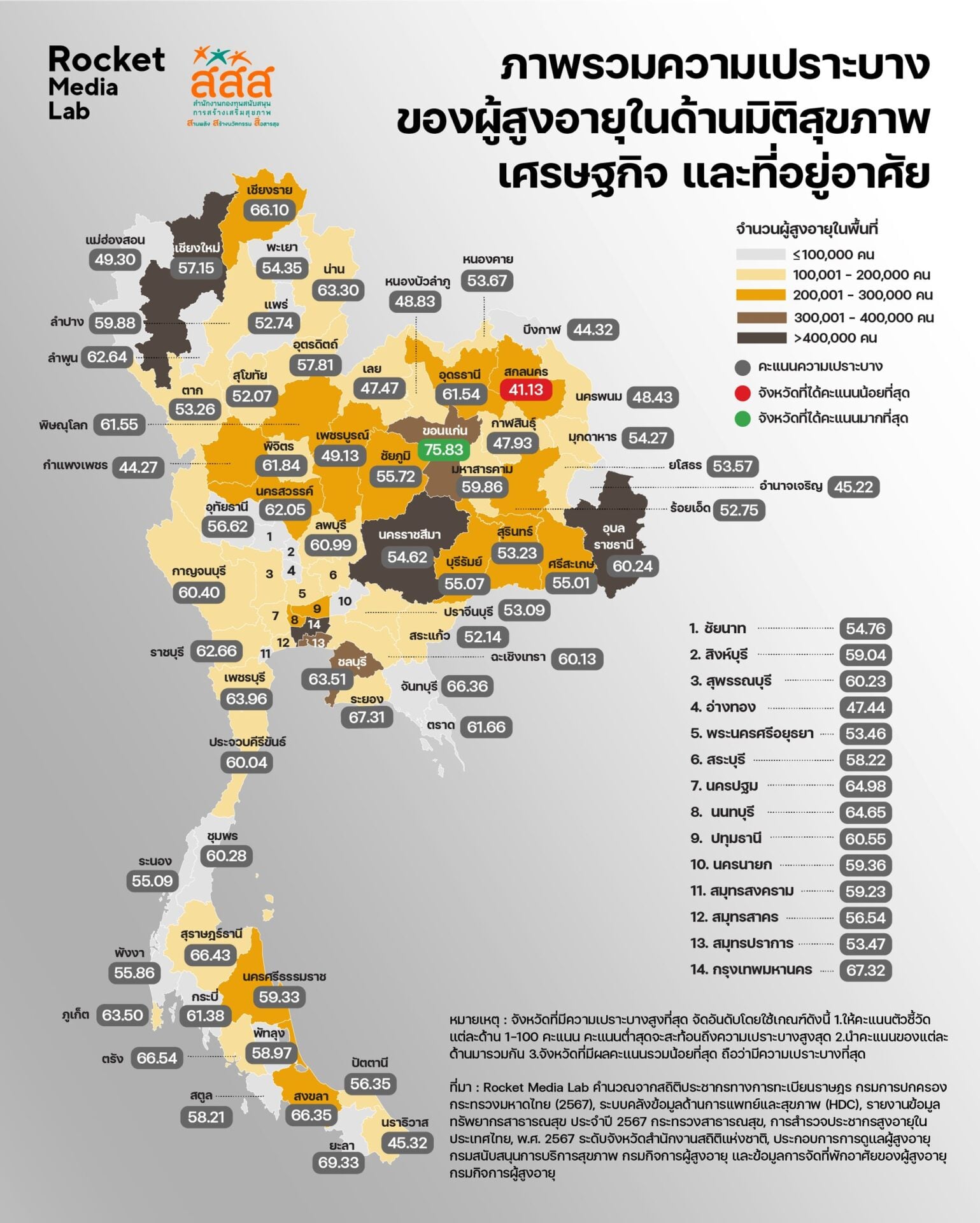 นายสันติชัย อาภรณ์ศรี บรรณาธิการบริหาร Rocket Media Lab กล่าวว่า รายงานสถานการณ์เด่นทางสุขภาพฯ มุ่งสำรวจสถานการณ์ความเปราะบางของผู้สูงอายุใน 3 มิติ คือ 1.มิติสุขภาพ พบว่า ผู้สูงอายุไทยมีอัตราการป่วยจากโรค NCDs อยู่ในระดับสูงต่อเนื่อง หลายพื้นที่ไม่มีศักยภาพด้านการดูแลและการรักษาที่เพียงพอ ในบางจังหวัดมีสัดส่วนผู้สูงอายุมากกว่า 10,000 คนต่ออายุรแพทย์ 1 คน และในบางจังหวัดมีสัดส่วนผู้สูงอายุมากกว่า 100,000 คนต่อจิตแพทย์ 1 คน สะท้อนถึงความเหลื่อมล้ำในการเข้าถึงระบบบริการสุขภาพ และความเสี่ยงต่อภาวะแทรกซ้อนที่เพิ่มขึ้นหากผู้สูงอายุต้องเจ็บป่วย