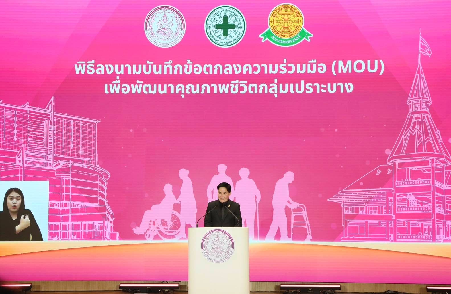 นายอัครา กล่าวต่อไปว่า วันนี้ การลงนามในบันทึกข้อตกลงความร่วมมือ (MOU) "โครงการบูรณาการความร่วมมือเพื่อพัฒนาคุณภาพชีวิตกลุ่มเปราะบาง" ระหว่างกระทรวงการพัฒนาสังคมและความมั่นคงของมนุษย์ กับโรงพยาบาลธรรมศาสตร์เฉลิมพระเกียรติ และคณะแพทยศาสตร์ มหาวิทยาลัยธรรมศาสตร์ นั้น นับเป็นตัวอย่างของการนำ นโยบายระดับชาติมาผสานกับ ศักยภาพระดับพื้นที่ระหว่างภารกิจด้านสังคมของกระทรวง พม. และศักยภาพด้านการแพทย์ของมหาวิทยาลัยธรรมศาสตร์ เพื่อให้ประชาชน โดยเฉพาะกลุ่มเปราะบางได้รับโอกาสในการรักษา ฟื้นฟู และกลับมามีคุณภาพชีวิตที่ดีขึ้น โดยไม่ต้องแบกรับภาระเกินความจำเป็น คือความร่วมมือที่มี “ผลลัพธ์จับต้องได้” ต่อกลุ่มเปราะบาง ความร่วมมือที่เราลงนามกันในวันนี้เป็นตัวอย่างของการนำ นโยบายระดับชาติมาผสานกับศักยภาพระดับพื้นที่ระหว่างภารกิจด้านสังคมของกระทรวง พม. และศักยภาพด้านการแพทย์ของมหาวิทยาลัยธรรมศาสตร์ เพื่อให้ประชาชนได้รับโอกาสในการรักษา ฟื้นฟู และกลับมามีคุณภาพชีวิตที่ดีขึ้น โดยไม่ต้องแบกรับภาระเกินความจำเป็น ซึ่งคือความร่วมมือที่มี “ผลลัพธ์จับต้องได้” ต่อประชาชนกลุ่มเปราะบาง และสิ่งที่สำคัญที่สุด คือ ความร่วมมือนี้ จะไม่หยุดเพียงการผ่าตัด หรือการรักษาเฉพาะหน้า แต่จะเป็นฐานสำคัญของการพัฒนาระบบการดูแลผู้สูงอายุในระยะยาวของประเทศเพื่อรองรับสังคมสูงวัยที่กำลังเป็นความท้าทายสำคัญของประเทศไทย