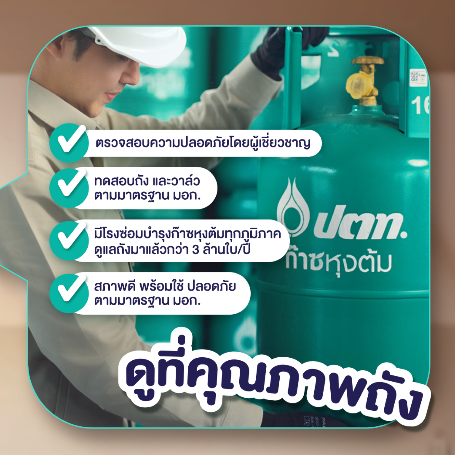 “ปลอดภัย” เพราะ ก๊าซหุงต้ม ปตท. เป็นแบรนด์แรกที่มีวาล์วเช็กล็อกสำหรับถัง 15 กิโลกรัม และ 48 กิโลกรัม มั่นใจ ปลอดภัย ก๊าซไม่รั่ว อีกทั้งยังมีโรงซ่อมที่กระจายทั่วทุกภูมิภาค พร้อมรองรับการทดสอบถังก๊าซตามกฎหมายและซ่อมบำรุงถังก๊าซทั่วประเทศ โดยโรงซ่อมถัง ก๊าซหุงต้ม ปตท. ของ OR ได้แก่ โรงซ่อมอยุธยา สงขลา และ ขอนแก่น ผ่านการรับรองกระบวนการซ่อมบำรุงถังก๊าซปิโตรเลียมเหลวหุงต้ม ตามมาตรฐาน มอก.151 ซึ่งเป็นมาตรฐานกระบวนการซ่อมบำรุง การตรวจสอบ และ การทดสอบถังก๊าซปิโตรเลียมเหลวหุงต้มที่กำหนดโดยสำนักงานมาตรฐานผลิตภัณฑ์อุตสาหกรรม (สมอ.) กระทรวงอุตสาหกรรม ถือเป็นบริษัทแรกของประเทศไทยที่ผ่านการรับรองในกระบวนการนี้