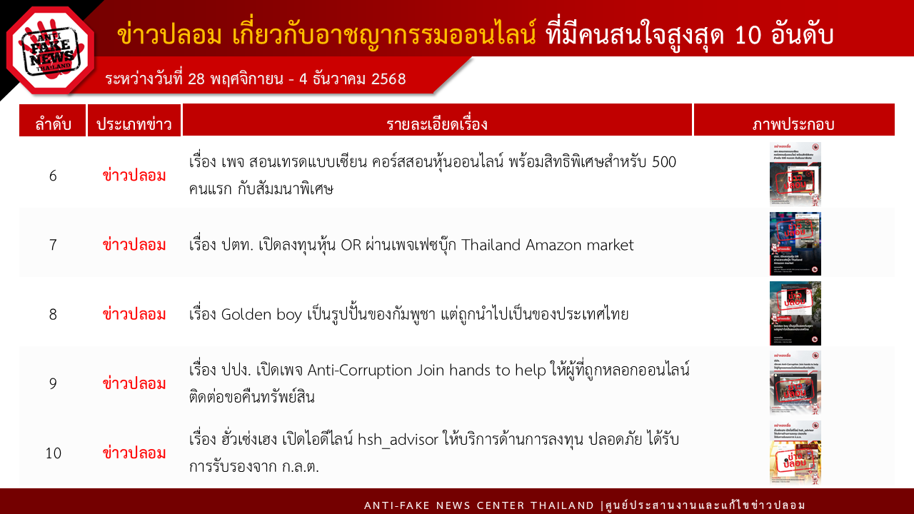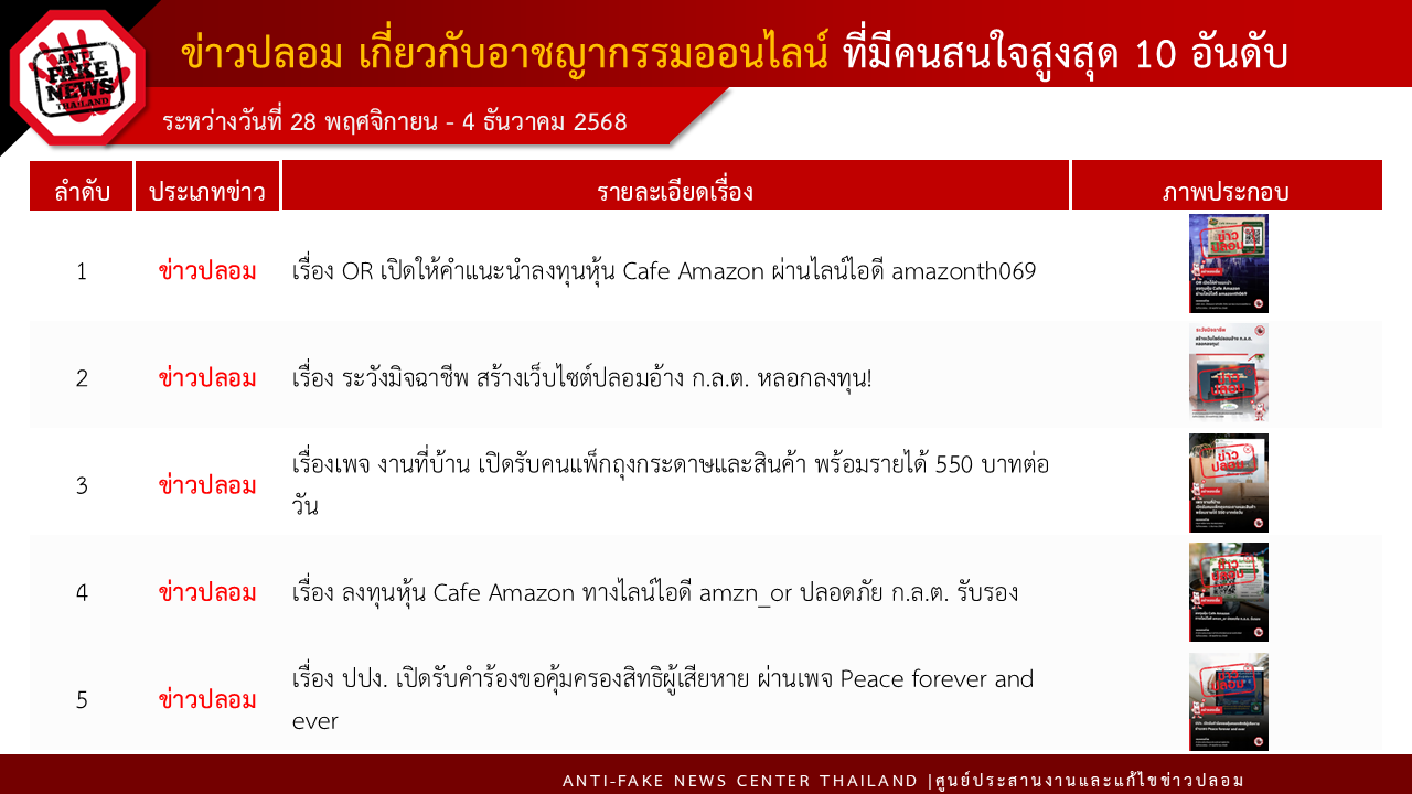 โดยนางสาวสุชาดา กล่าวรายงานว่า ระหว่างวันที่ 28 พฤศจิกายน – 4 ธันวาคม 2568 พบข้อความที่เข้ามาทั้งหมด 1,050,113 ข้อความ โดยมีข้อความที่ต้องดำเนินการตรวจสอบ (Verify) ทั้งสิ้น 985 ข้อความ สำหรับช่องทางที่มีการพบเบาะแสมากที่สุด คือ ข้อความที่มาจาก Social Listening จำนวน 961 ข้อความ ตามมาด้วยการแจ้งเบาะแสผ่าน Line Official จำนวน 24 ข้อความ รวมเรื่องที่ต้องดำเนินการตรวจสอบทั้งหมด 235 เรื่อง และจากการประสานงานกับหน่วยงานที่เกี่ยวข้อง ได้รับผลการตรวจสอบกลับมาแล้ว 102 เรื่อง โดยในจำนวนนี้เป็นข่าวปลอมเกี่ยวกับอาชญากรรมออนไลน์ที่ได้รับความสนใจจากประชาชนมากที่สุด 10 อันดับ ได้แก่