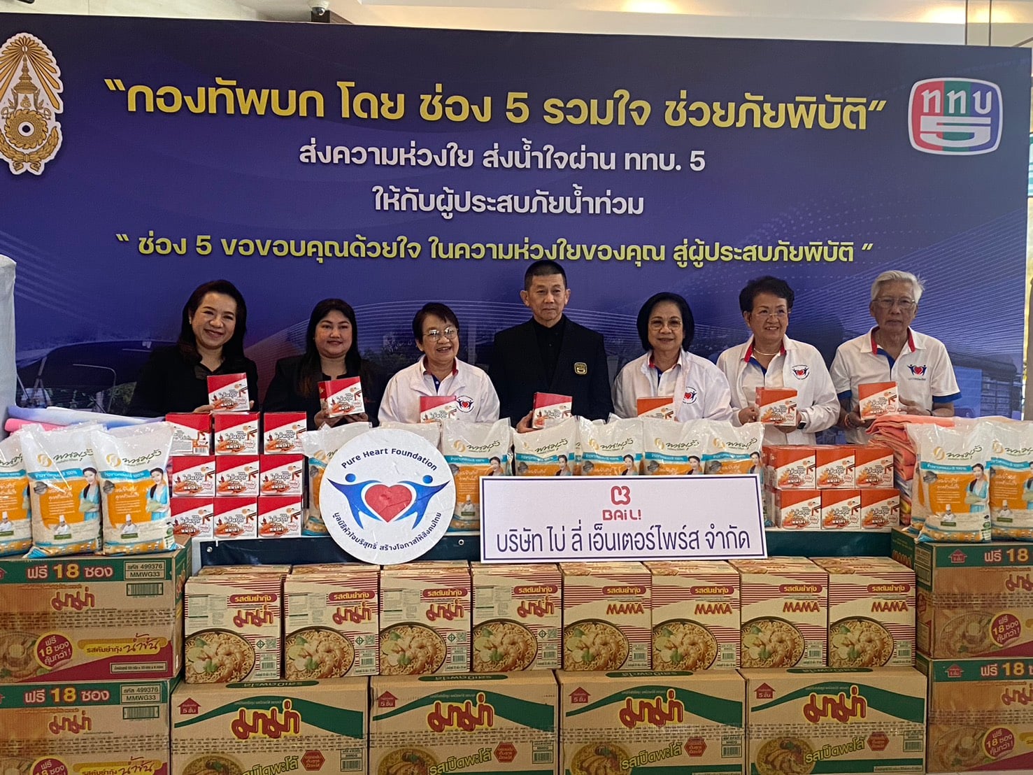การสนับสนุนสิ่งของในครั้งนี้ เกิดขึ้นหลังจากรายการ “สนามเป้า บรรเทาทุกข์” ได้รับแจ้งผ่านองค์การบริหารส่วนตำบล (อบต.) ในพื้นที่ว่ามีประชาชนที่ได้รับความเดือดร้อนเป็นจำนวนมาก ทางมูลนิธิหัวใจบริสุทธิ์จึงประสานขอความช่วยเหลือจากพันธมิตรภาคเอกชน และจัดเตรียมสิ่งของจำเป็นเพื่อส่งมอบอย่างเร่งด่วน โดยประกอบด้วย ข้าวสาร ถุงละ 5 กิโลกรัม จำนวน 500 ถุง มูลค่า 55,000 บาท จากบริษัทไทย สมายล์ บัส จำกัด ผ้าห่มกันหนาว จากบริษัท พลังงานบริสุทธิ์ จำกัด (มหาชน) จำนวน 300 ผืน มูลค่า 22,500 บาท จากบริษัท เอส ซี เปเปอร์-แพ็ค จำกัด จำนวน 300 ผืน มูลค่า 22,500 บาท รวมทั้งสิ้น 600 ผืน มูลค่ารวม 45,000 บาท ขนมเส้นบุกปรุงรสหม่าล่า จำนวน 36,000 ชิ้น มูลค่า 360,000 บาท และบะหมี่กึ่งสำเร็จรูป จำนวน 7,800 ซอง จากบริษัท ไทยสแตนเลย์การไฟฟ้า จำกัด (มหาชน) โดยมี พลโทนภดล แก้วกำเนิด รองผู้อำนวยการใหญ่สายงานปฏิบัติการสถานีวิทยุโทรทัศน์กองทัพบก เป็นผู้แทนรับมอบ ณ สถานีวิทยุโทรทัศน์กองทัพบก ซึ่งสิ่งของทั้งหมดจะถูกขนส่งผ่านรถบรรทุกสิบล้อ ซึ่งได้รับการอำนวยความสะดวก จาก ดร.ทองอยู่ คงขันธ์ ประธานสหพันธ์การขนส่งทางบกแห่งประเทศไทย