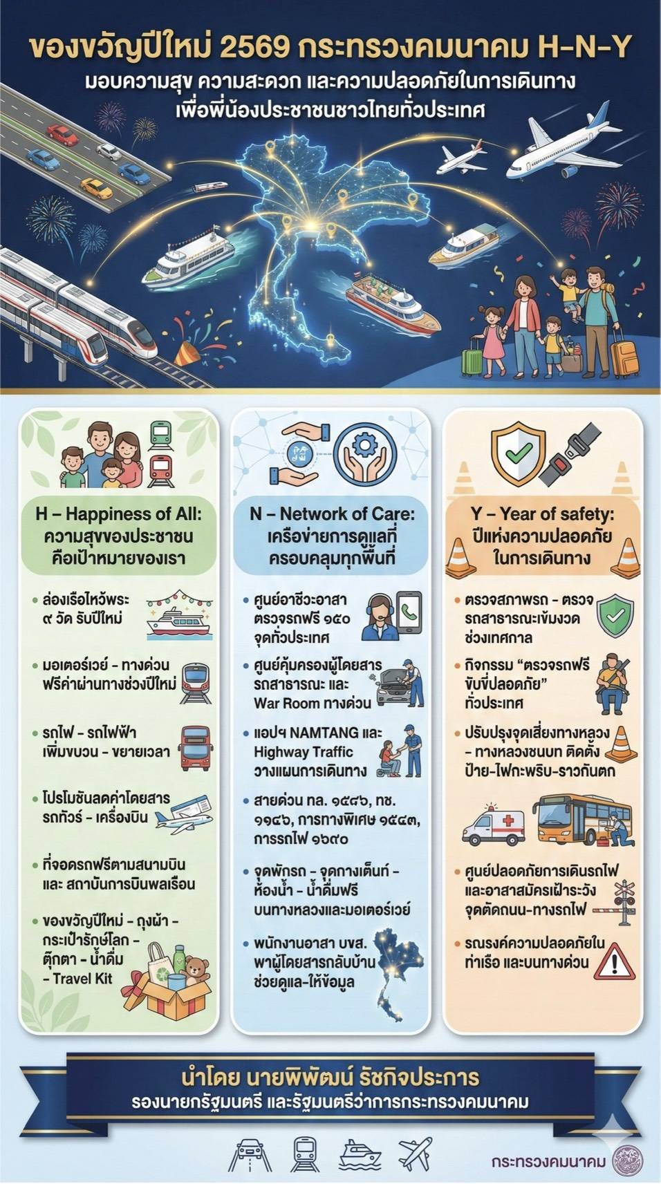 นายพิพัฒน์ รัชกิจประการ รองนายกรัฐมนตรีและรัฐมนตรีว่าการกระทรวงคมนาคม เปิดเผยว่า ที่ประชุมคณะรัฐมนตรี (ครม.) มีมติรับทราบ “ของขวัญปีใหม่ 2569” จากกระทรวงคมนาคม ภายใต้แนวคิด “H.N.Y 2569 – Happiness of All, Network of Care, Year of Safety” โดยมีนางสาวมัลลิกา จิระพันธุ์วาณิช รัฐมนตรีช่วยว่าการกระทรวงคมนาคม นายชยธรรม์ พรหมศร ปลัดกระทรวงคมนาคม และผู้บริหารทุกหน่วยงานร่วมกันจัดมาตรการ ลดค่าใช้จ่าย เพิ่มทางเลือกการเดินทาง และมอบของที่ระลึกแทนคำขอบคุณประชาชนที่ใช้บริการระบบคมนาคมของรัฐตลอดทั้งปี