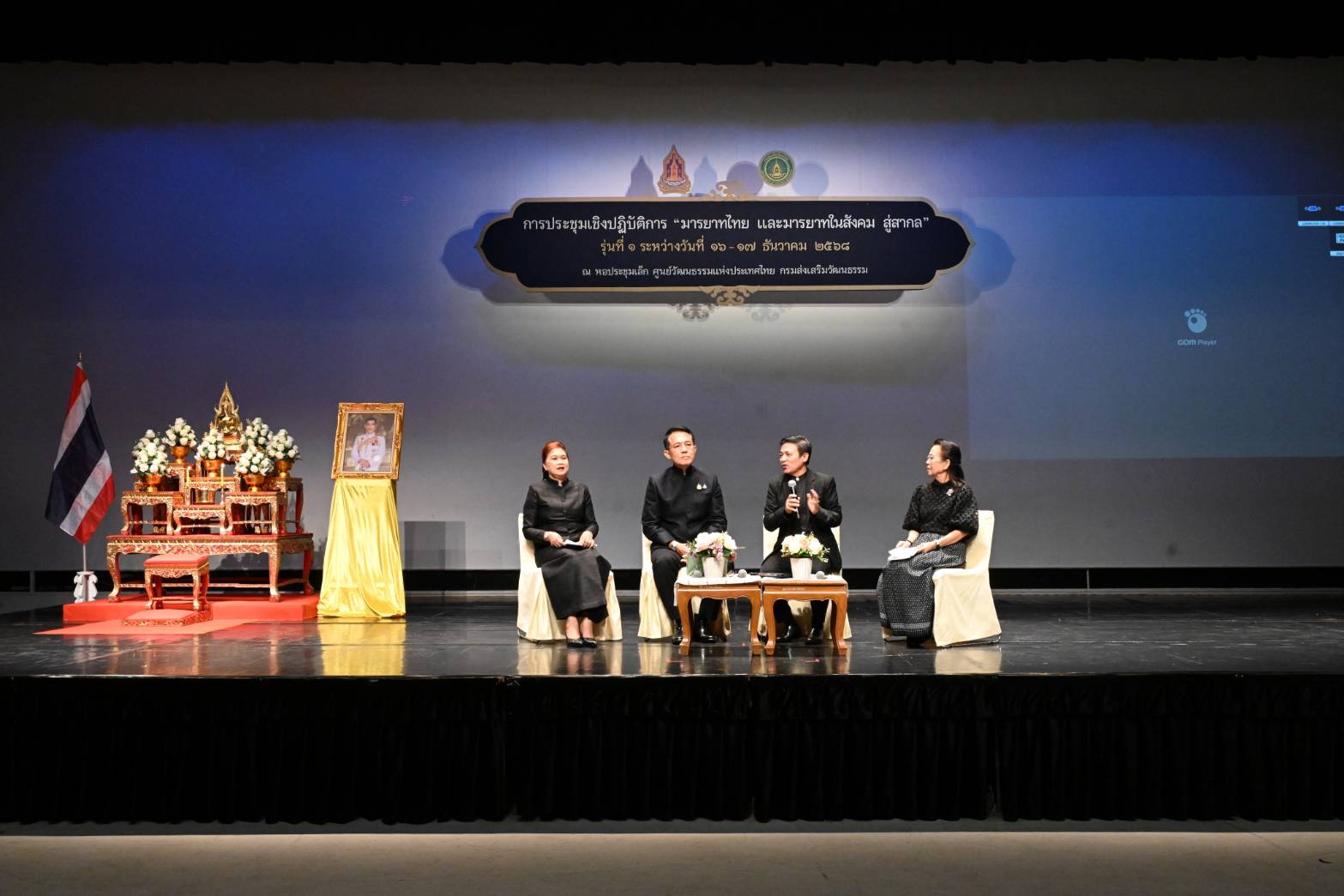 นายบันเทิง เพียรค้า ผู้อำนวยการกลุ่มค่านิยมและความเป็นไทย รักษาราชการแทนผู้อำนวยการสถาบันวัฒนธรรมศึกษา กล่าวว่า การประชุมเชิงปฏิบัติการ “มารยาทไทย และมารยาทในสังคม สู่สากล” มีวัตถุประสงค์เพื่อพัฒนาศักยภาพของครู อาจารย์ บุคลากรทางการศึกษาและข้าราชการของกรมส่งเสริมวัฒนธรรม ให้มีความรู้ความเข้าใจในการเป็นวิทยากรด้านมารยาทไทยมารยาทในสังคม แนวปฏิบัติอันเกี่ยวเนื่องกับงานพระบรมศพ การถวายสักการะพระบรมศพสมเด็จพระนางเจ้าสิริกิติ์ พระบรมราชินีนาถ พระบรมราชชนนีพันปีหลวง และการจัดโต๊ะหมู่บูชา รวมทั้งการเข้าร่วมกิจกรรม “ริบบิ้น ร้อยดวงใจถวายความอาลัยพระพันปีหลวง” ภายใต้โครงการหนึ่งความดี ล้านความรัก ภูมิใจภักดิ์พระพันปีหลวง โดยในปีงบประมาณพุทธศักราช 2569 กำหนดจัดการประชุมเชิงปฏิบัติการ“มารยาทไทย และมารยาทในสังคม สู่สากล” จำนวน ๔ รุ่น โดยครั้งนี้เป็นการประชุมเชิงปฏิบัติการฯ รุ่นที่ 1 จัดขึ้นระหว่างวันที่ 16- 17ธันวาคม พ.ศ.2568