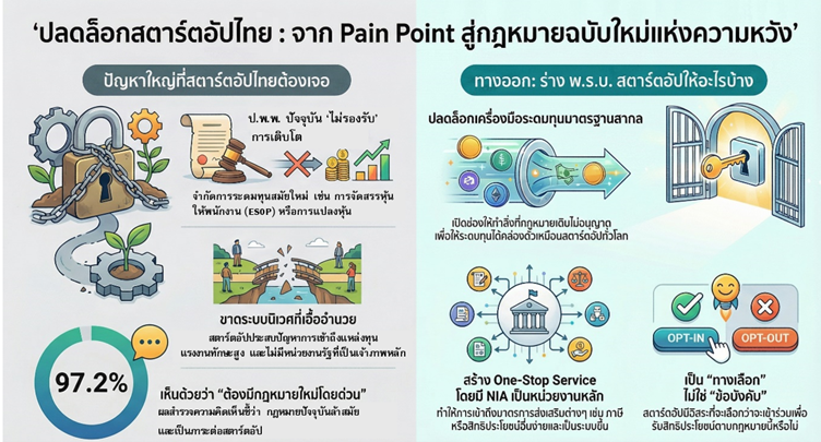 ร่าง พ.ร.บ. สตาร์ตอัป เป็นความพยายามของภาครัฐและเอกชนในการแก้ไข Pain Point เชิงโครงสร้างที่ขัดขวางการเติบโตของธุรกิจนวัตกรรมไทยมายาวนาน โดยกำหนดให้สตาร์ตอัปเข้าถึงรูปแบบการระดมทุนสมัยใหม่ ลดข้อจำกัดตาม ป.พ.พ. และเชื่อมโยงมาตรการส่งเสริมจากกฎหมายอื่นให้เข้าถึงง่ายขึ้นอย่างเป็นระบบ ร่างกฎหมายนี้ยังเป็น “เครื่องมือทางเลือก” ที่ไม่บังคับใช้กับทุกราย แต่ถูกออกแบบเพื่อสร้างระบบนิเวศที่เอื้อต่อการแข่งขัน เสริมความเชื่อมั่นของนักลงทุนและยกระดับศักยภาพสตาร์ตอัปไทยให้ทัดเทียมมาตรฐานสากล