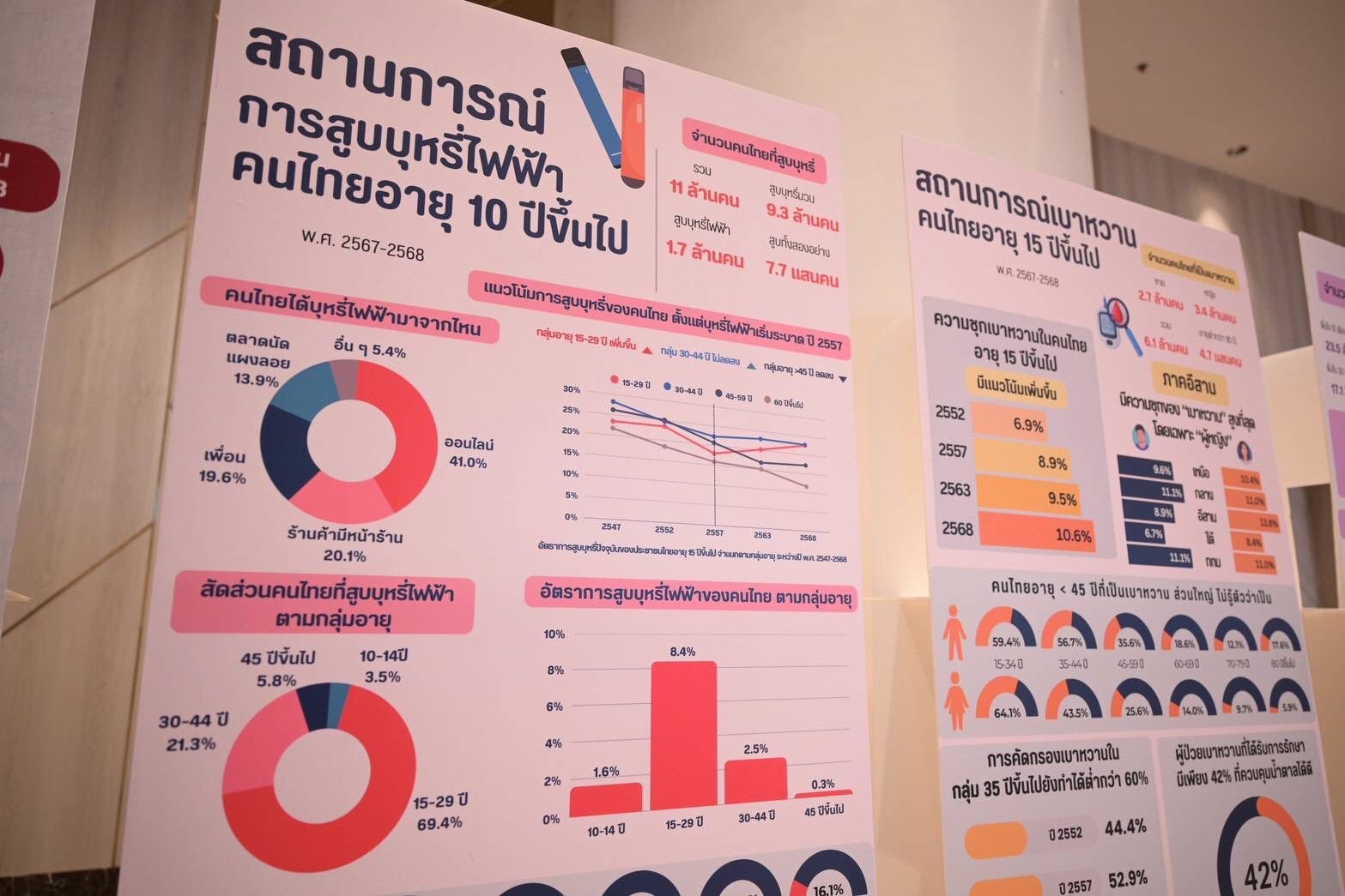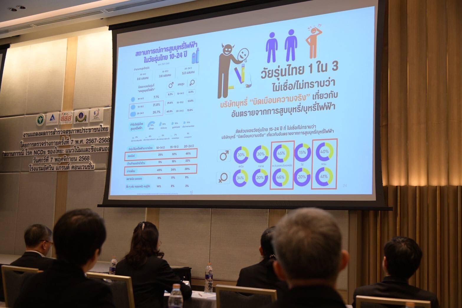 ประเด็นที่น่าห่วงยิ่งกว่าคือ พฤติกรรมเสี่ยงกำลังขยายตัวในกลุ่มคนอายุน้อย รศ. พญ.เริงฤดี ปธานวนิช หัวหน้าโครงการสำรวจฯ ชี้ว่า ในกลุ่มอายุ 15-34 ปี หากไม่มีปัจจัยเสี่ยง โอกาสป่วยเบาหวานมีเพียงร้อยละ 0.3 แต่หากมีพฤติกรรมเสี่ยงหลายด้านพร้อมกัน ความเสี่ยงจะพุ่งสูงถึงร้อยละ 45.2 ขณะที่การสูบบุหรี่และดื่มสุรามีแนวโน้มเพิ่มขึ้นในกลุ่มวัยรุ่นและวัยทำงาน โดยเฉพาะบุหรี่ไฟฟ้าที่พบว่าผู้ใช้กว่า 70% มีอายุต่ำกว่า 30 ปี