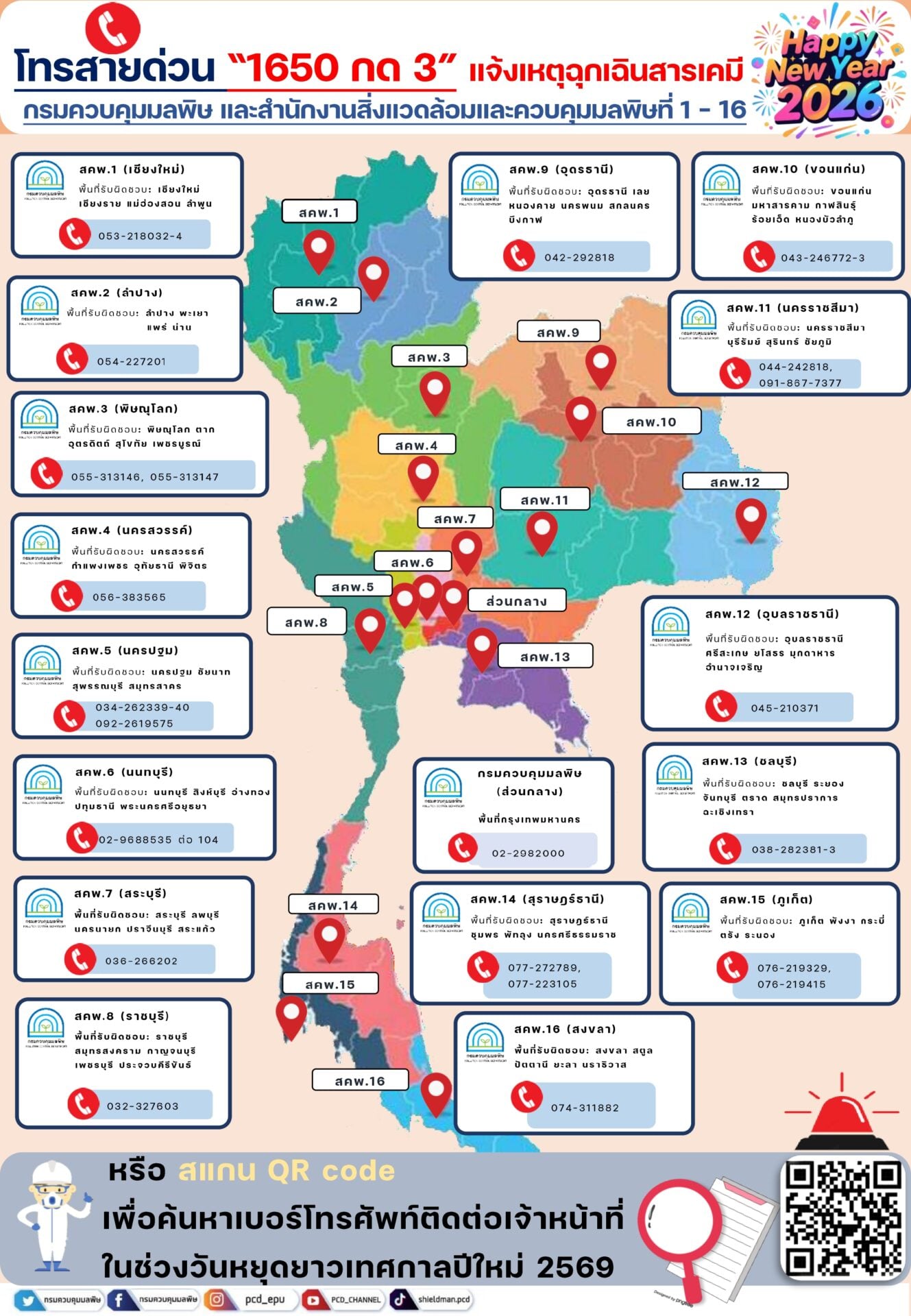 นายสุรินทร์ วรกิจธำรง อธิบดีกรมควบคุมมลพิษ (คพ.) กระทรวงทรัพยากรธรรมชาติและสิ่งแวดล้อม (ทส.) เปิดเผยว่า นายสุชาติ ชมกลิ่น รองนายกรัฐมนตรี และรัฐมนตรีว่าการกระทรวงทรัพยากรธรรมชาติและสิ่งแวดล้อม ได้กำชับหน่วยงานในสังกัด ทส. เตรียมความพร้อมดูแลความปลอดภัยของประชาชนในช่วงวันหยุดยาวเทศกาลปีใหม่ 2569 โดยมอบหมายให้กรมควบคุมมลพิษจัดเตรียมทีมตอบโต้เหตุฉุกเฉินด้านสิ่งแวดล้อมของศูนย์ปฏิบัติการพิทักษ์สิ่งแวดล้อม (ศปก.พล.) พร้อมเครื่องมือและอุปกรณ์ สนับสนุนการปฏิบัติงานของหน่วยงานท้องถิ่นในการตรวจวัดคุณภาพสิ่งแวดล้อม และให้คำแนะนำทางวิชาการเพื่อป้องกันและแก้ไขปัญหาที่อาจเกิดขึ้นจากอุบัติภัยสารเคมี