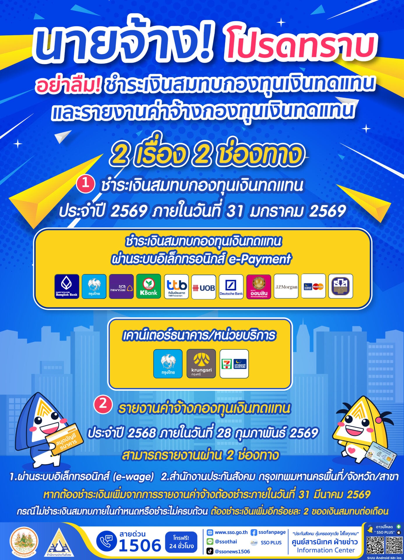นางสาวกาญจนา พูลแก้ว เลขาธิการสำนักงานประกันสังคม เปิดเผยว่า สำนักงานประกันสังคม ขอแจ้งเตือนนายจ้างทุกแห่งให้ดำเนินการ ชำระเงินสมทบกองทุนเงินทดแทน ประจำปี 2569 ภายในวันที่ 31 มกราคม 2569 เพื่อประโยชน์สูงสุดแก่ลูกจ้างในการได้รับสิทธิประโยชน์จากกองทุนเงินทดแทน