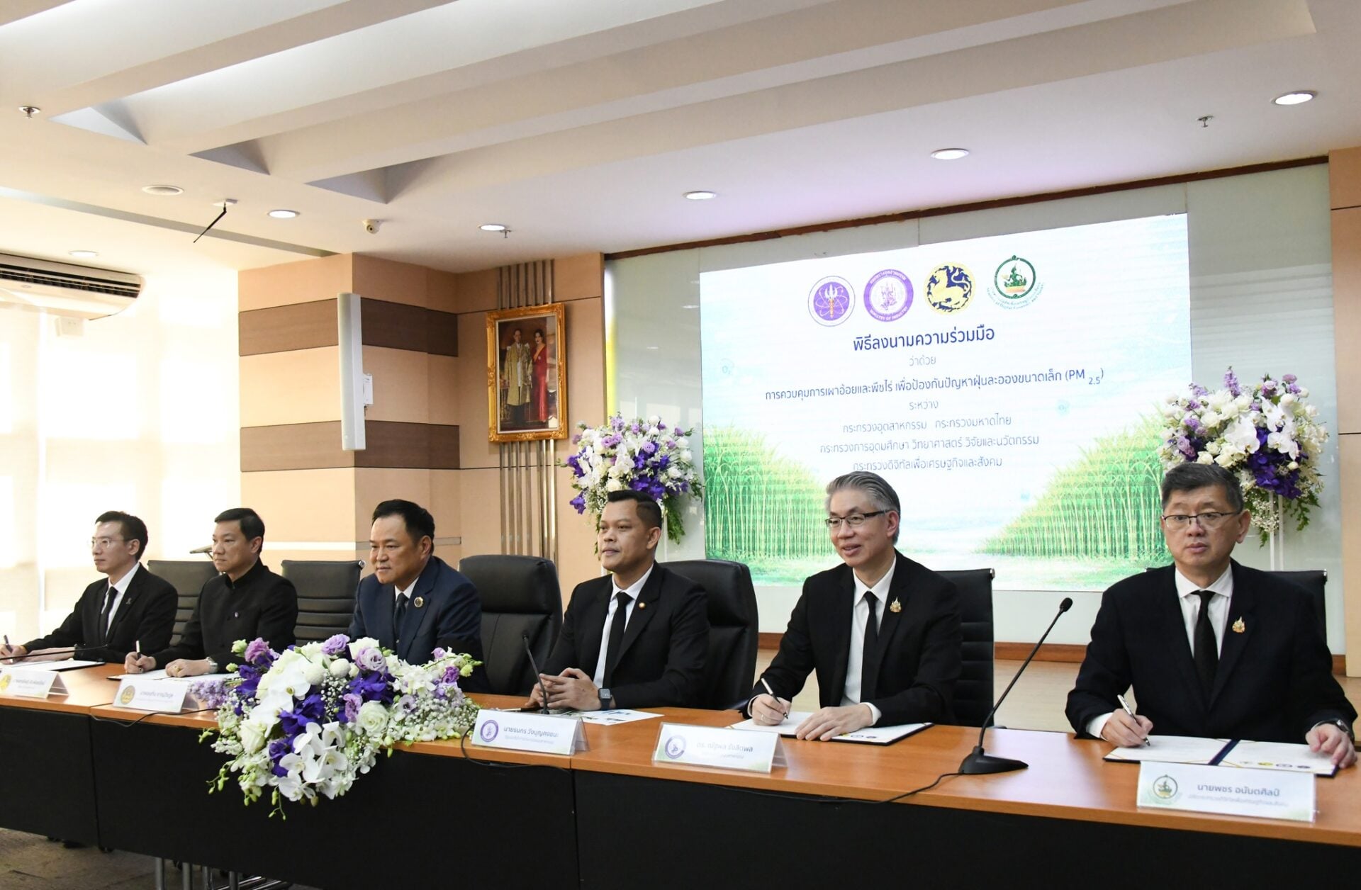พิธีลงนามความร่วมมือในครั้งนี้ได้รับเกียรติจาก นายอนุทิน ชาญวีรกูล นายกรัฐมนตรี และรัฐมนตรีว่าการกระทรวงมหาดไทย และ ดร.ธนกร วังบุญคงชนะ รัฐมนตรีว่าการกระทรวงอุตสาหกรรม ร่วมเป็นสักขีพยาน โดยมี ดร.ณัฐพล รังสิตพล ปลัดกระทรวงอุตสาหกรรม (อก.) นายอรรษิษฐ์ สัมพันธรัตน์ ปลัดกระทรวงมหาดไทย (มท.) ศาสตราจารย์ ดร.ศุภชัย ปทุมนากุล ปลัดกระทรวงการอุดมศึกษา วิทยาศาสตร์ วิจัยและนวัตกรรม (อว.) และนายพชร อนันตศิลป์ ปลัดกระทรวงดิจิทัลเพื่อเศรษฐกิจและสังคม (ดีอี) ร่วมเป็นประธานและลงนามความร่วมมือว่าด้วยการควบคุมการเผาอ้อยและพืชไร่ เพื่อป้องกันปัญหาฝุ่นละอองขนาดเล็ก (PM 2.5) ณ ห้องประชุม อก. 1 ชั้น 2 สำนักงานปลัดกระทรวงอุตสาหกรรม โดยมีผู้บริหารระดับสูงของกระทรวงมหาดไทย กระทรวงการอุดมศึกษา วิทยาศาสตร์ วิจัยและนวัตกรรม และกระทรวงดิจิทัลเพื่อเศรษฐกิจและสังคม ร่วมเป็นสักขีพยานโดยพร้อมเพรียงกัน