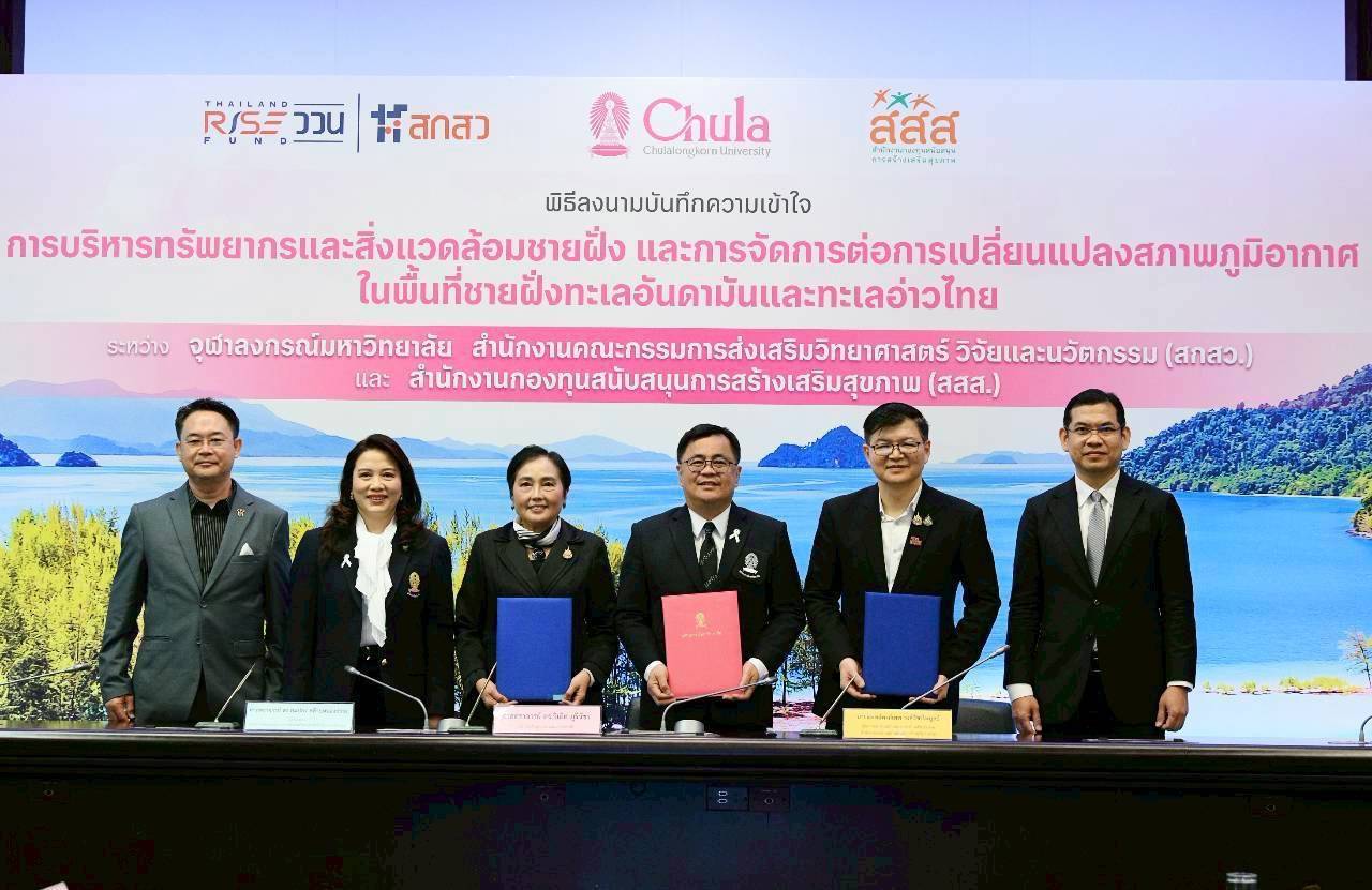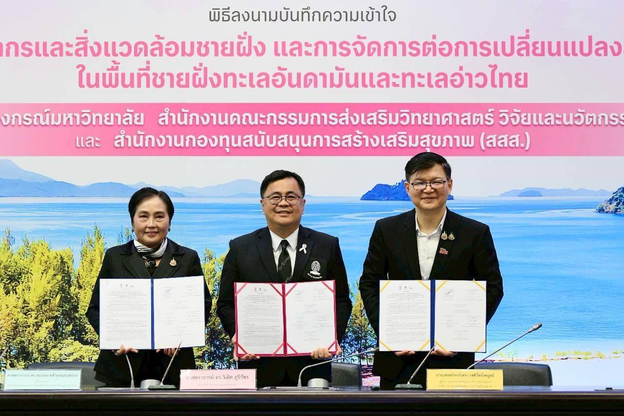 สำนักงานกองทุนสนับสนุนการสร้างเสริมสุขภาพ (สสส.) ร่วมกับ สำนักงานคณะกรรมการส่งเสริมวิทยาศาสตร์ วิจัยและนวัตกรรม (สกสว.) และจุฬาลงกรณ์มหาวิทยาลัย จัดพิธีลงนามบันทึกข้อตกลงความร่วมมือในการสนับสนุนการบริหารทรัพยากรและสิ่งแวดล้อมชายฝั่งและการจัดการต่อการเปลี่ยนแปลงสภาพภูมิอากาศ ในพื้นที่ชายฝั่งทะเลอันดามันและทะเลอ่าวไทย เพื่อสนับสนุนการบริหารจัดการทรัพยากรและสิ่งแวดล้อม