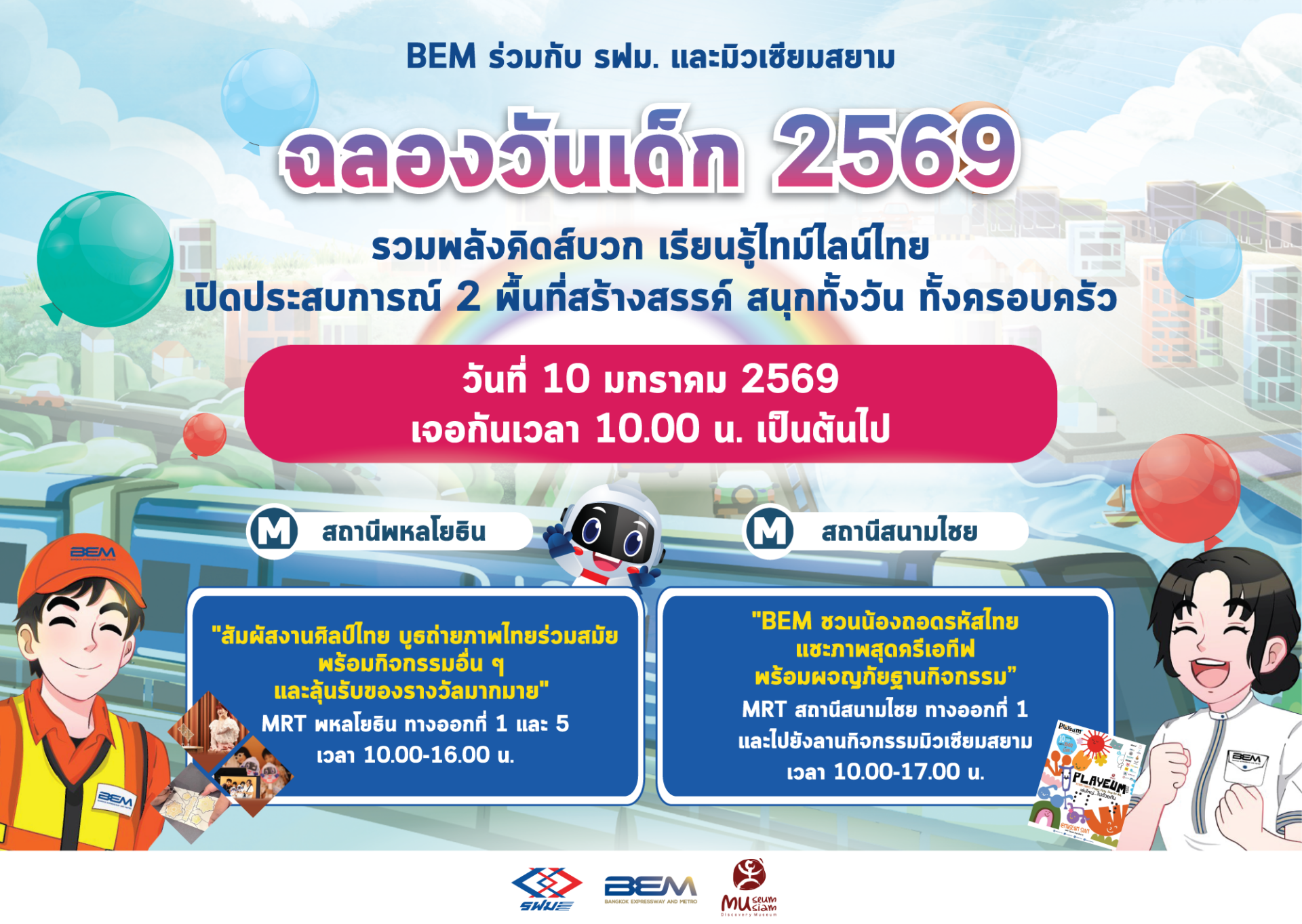 บริษัท ทางด่วนและรถไฟฟ้ากรุงเทพ จำกัด (มหาชน) (BEM) ร่วมกับ 2 พันธมิตร การรถไฟฟ้าขนส่งมวลชนแห่งประเทศไทย (รฟม.) และ พิพิธภัณฑ์การเรียนรู้แห่งชาติ หรือมิวเซียมสยาม จัดงานวันเด็ก 2 สถานที่ 2 ธีมสุดสนุก รวมพลังคิดส์บวก เรียนรู้ไทม์ไลน์ไทย ในวันเสาร์ที่ 10 มกราคม 2569 ตั้งแต่ 10.00 น. เป็นต้นไป