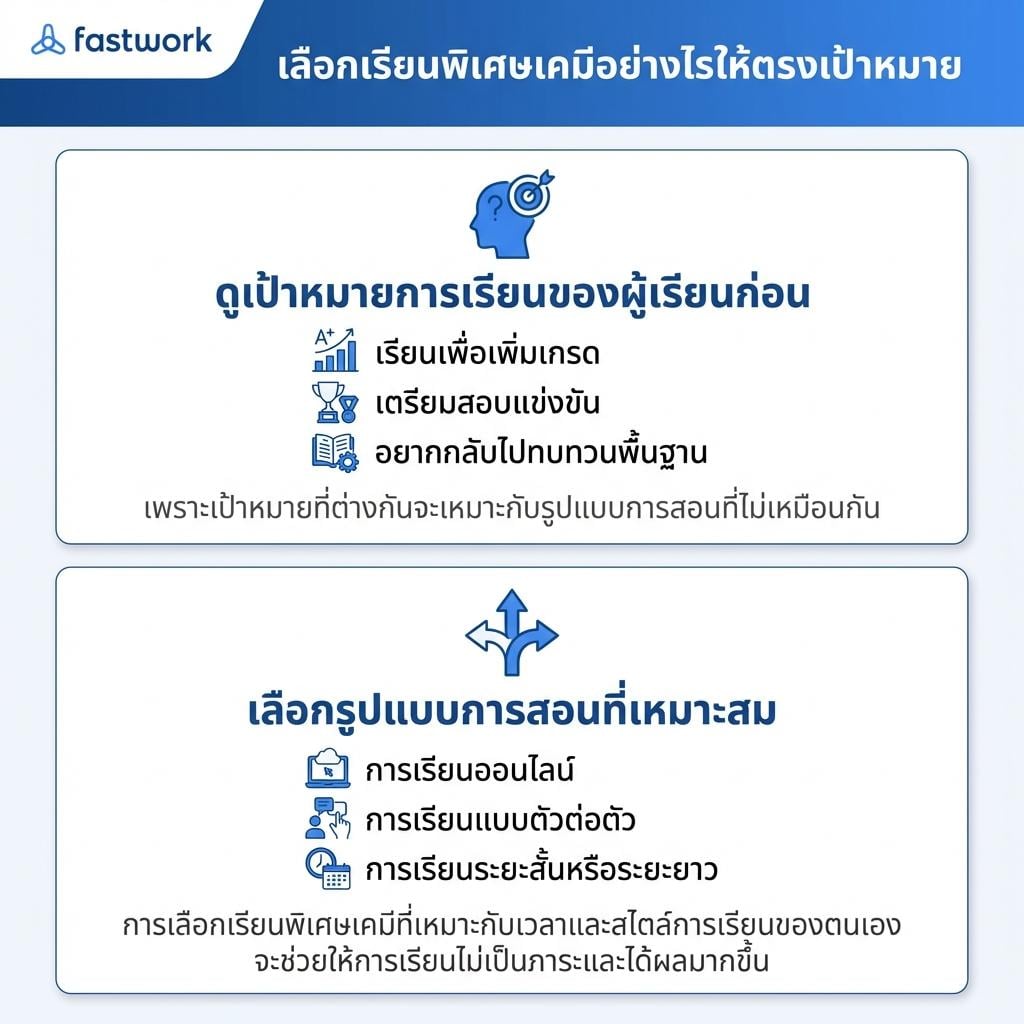 สำหรับผู้เรียนที่ต้องการตัวช่วยในการทำความเข้าใจเคมีให้ลึกขึ้น การมีครูสอนหรือ ติวเตอร์เคมี ที่สามารถปรับวิธีอธิบายให้เข้ากับพื้นฐานและจังหวะการเรียนของแต่ละคน ถือเป็นอีกหนึ่งทางเลือกที่ช่วยลดความสับสนในการเรียนได้ ปัจจุบันแพลตฟอร์มอย่าง Fastwork เปิดโอกาสให้ผู้เรียนได้ค้นหาและเปรียบเทียบครูและติวเตอร์จากหลากหลายแนวการสอน ทั้งแบบออนไลน์และแบบตัวต่อตัว เพื่อให้สามารถเลือกแนวทางการเรียนที่สอดคล้องกับเป้าหมายของตนเองมากที่สุด โดยไม่จำเป็นต้องเร่งหรือกดดัน แต่เป็นการเรียนรู้ที่ค่อยเป็นค่อยไปและเข้าใจได้จริง