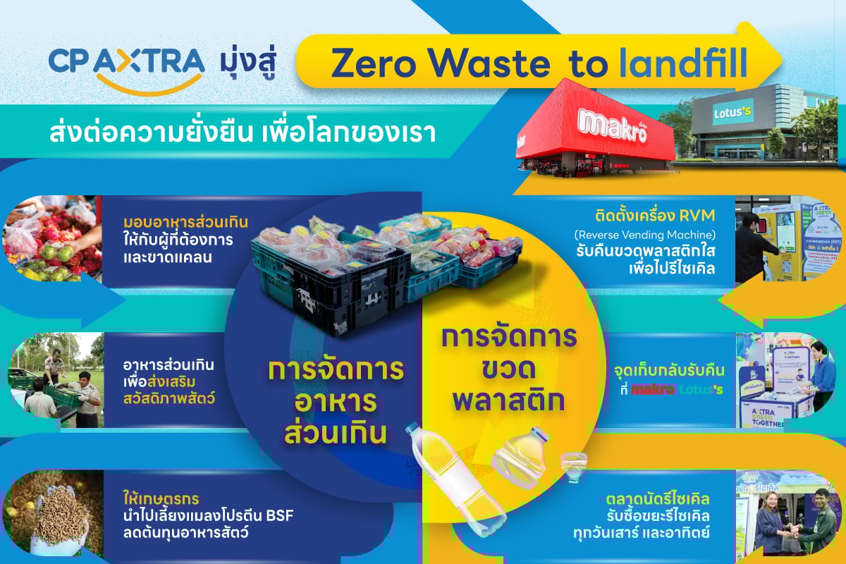ซีพี แอ็กซ์ตร้า ยกระดับโมเดลจัดการขยะครบวงจร ตั้งแต่ต้นทางจนถึงปลายทาง บริหารจัดการอาหารส่วนเกินอย่างมีประสิทธิภาพ ส่งต่ออาหารส่วนเกินไปที่ภาคเกษตรกร ส่งต่ออาหารคุณภาพดีให้กับชุมชน รวมถึงสัตว์ป่าที่สถานีเพาะเลี้ยง และส่งเสริมการนำขยะไปรีไซเคิลแบบ 100% มุ่งสู่การทิ้งขยะสู่หลุมฝังกลบให้เป็นศูนย์ ส่งต่อความยั่งยืน เพื่อโลกของเรา