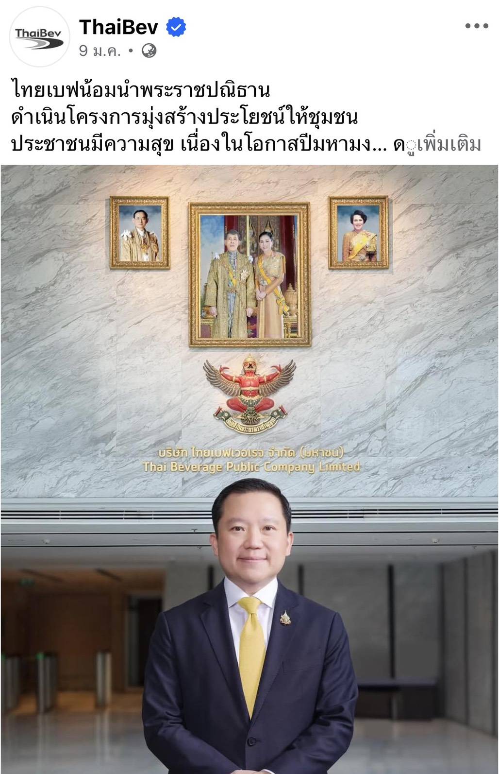 ทั้งนี้ เมื่อวันที่ 9 มกราคม 2569 เฟสบุ๊ค ThaiBev โพสต์ว่า “เนื่องในโอกาสปีมหามงคล พุทธศักราช 2569 และ 2570 อันประกอบด้วยวาระพิเศษ กลุ่มบริษัท ไทยเบฟเวอเรจ จำกัด (มหาชน) (“ไทยเบฟ”) โดย นายฐาปน สิริวัฒนภักดี ประธานเจ้าหน้าที่บริหาร ขอน้อมนำพระปฐมบรมราชโองการของพระบาทสมเด็จพระปรเมนทรรามาธิบดีศรีสินทร มหาวชิราลงกรณ พระวชิรเกล้าเจ้าอยู่หัว ที่จะทรง “สืบสาน รักษา และต่อยอด และครองแผ่นดินโดยธรรม เพื่อประโยชน์สุขแห่งอาณาราษฎรตลอดไป” พร้อมทั้งน้อมนำหลักปรัชญาของเศรษฐกิจพอเพียงตามแนวพระราชดำริของพระบาทสมเด็จพระบรมชนกาธิเบศร มหาภูมิพลอดุลยเดชมหาราช บรมนาถบพิตร มาเป็นแนวทางในการดำเนินงาน เพื่อนำไปต่อยอดและขยายผลโดยมุ่งหมายให้ “สร้างประโยชน์ให้ชุมชน ประชาชนมีความสุข”