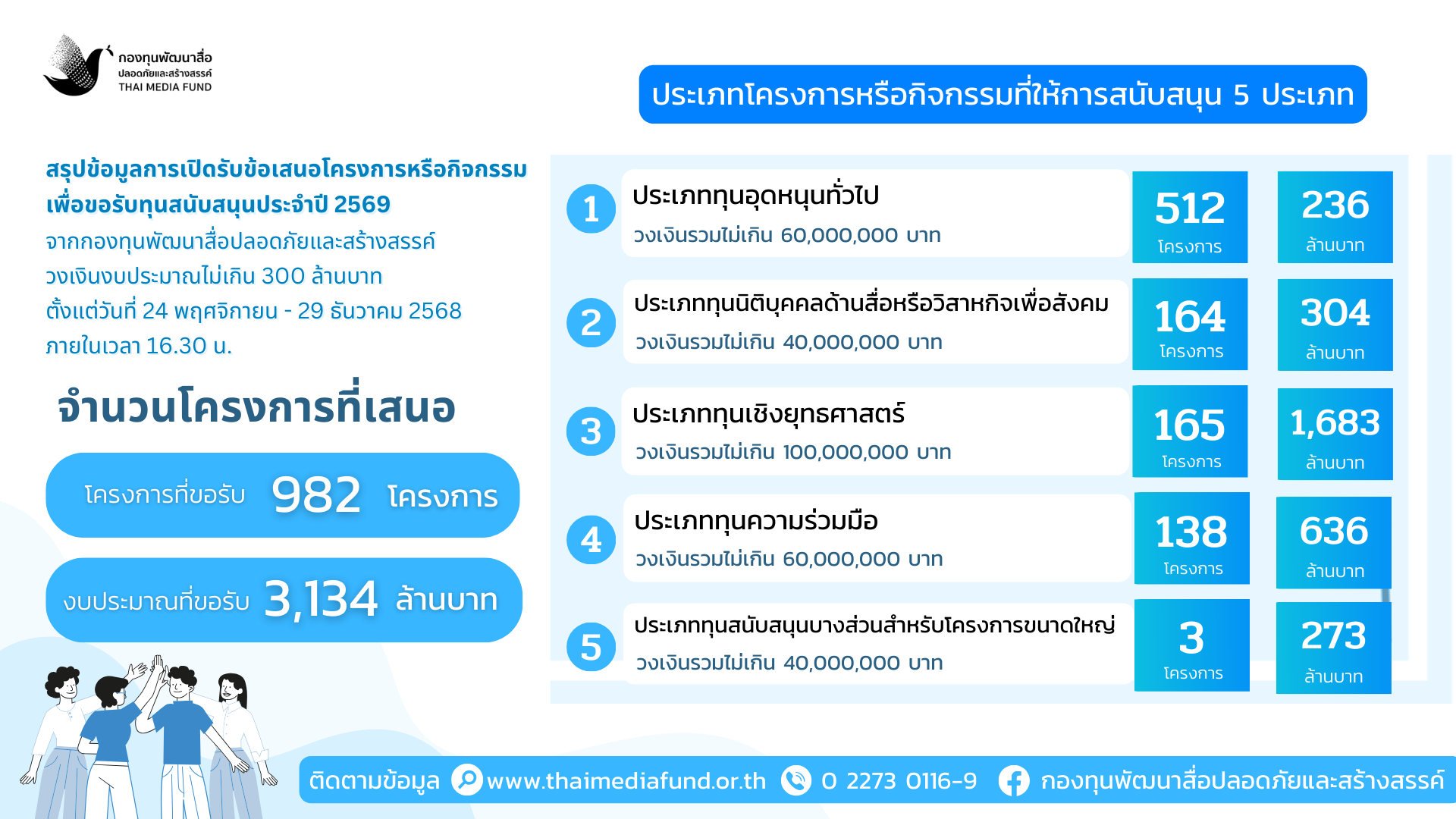 และรับทราบเรื่องการรายงานความคืบหน้าการเปิดรับโครงการหรือกิจกรรมที่ขอรับการสนับสนุนเงินจากกองทุนพัฒนาสื่อปลอดภัยและสร้างสรรค์ ประจำปี 2569 วงเงินงบประมาณ 300 ล้านบาท โดยมีจำนวนโครงการฯ ที่ยื่นเสนอ จำนวน 982 โครงการ งบประมาณที่ขอรับรวม 3,134 ล้านบาท แบ่งเป็น 5 ประเภท