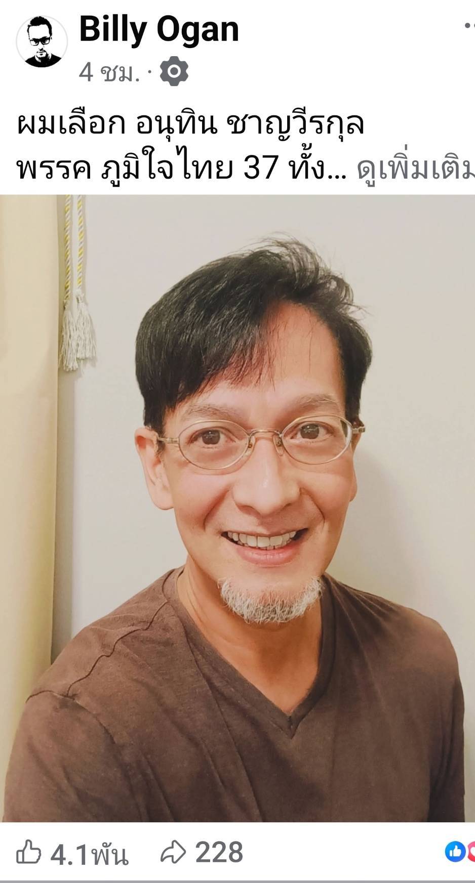 ศิลปินเพลงร็อกเกอร์รุ่นใหญ่ระดับตำนาน “บิลลี่ โอแกน” ได้ออกมาเคลื่อนไหวผ่านเฟซบุ๊กส่วนตัว โพสต์แสดงท่าทีชัดเจนว่าจะเลือก พรรคภูมิใจไทย ทั้งระบบเขตและบัญชีรายชื่อ เบอร์ 37 โดยระบุว่า