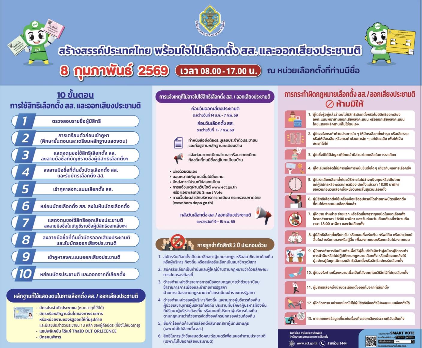 สำนักงานคณะกรรมการการเลือกตั้ง ขอเชิญชวนประชาชนผู้มีสิทธิเลือกตั้ง ออกมาใช้สิทธิเลือกตั้ง สส. และออกเสียงประชามติ ในวันอาทิตย์ที่ 8 กุมภาพันธ์ 2569 เวลา 08.00 – 17.00 น. ณ หน่วยเลือกตั้งที่ท่านมีชื่อ