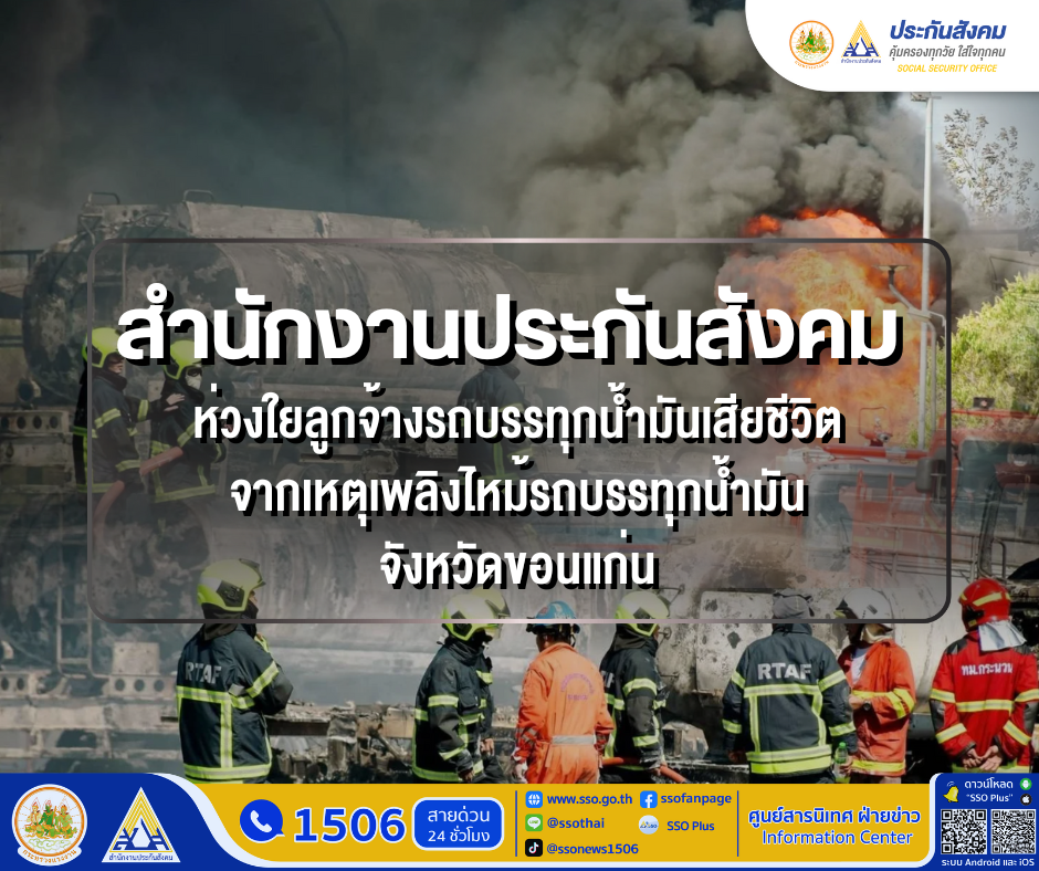 สำนักงานประกันสังคม ขอแสดงความเสียใจอย่างสุดซึ้งต่อครอบครัวของลูกจ้างผู้เสียชีวิตจากเหตุเพลิงไหม้รถบรรทุกน้ำมัน ซึ่งเกิดขึ้นเมื่อวันที่ 2 กุมภาพันธ์ 2569 เวลาประมาณ 09.40 น. ณ บริเวณจุดกระจายน้ำมันด้านหลังปั๊มสุขสันต์กรุ๊ป ถนนกระนวน–ท่าคันโท ตำบลหนองโก อำเภอกระนวน จังหวัดขอนแก่น เหตุการณ์ดังกล่าวมีรถบรรทุกน้ำมันเกี่ยวข้องจำนวน 5 คัน ถูกเพลิงไหม้เสียหาย 3 คัน ส่งผลให้มีพนักงานขับรถเสียชีวิตในที่เกิดเหตุ 1 ราย และมีผู้ได้รับบาดเจ็บเล็กน้อย 2 ราย นับเป็นความสูญเสียที่สร้างความสะเทือนใจแก่ครอบครัวผู้ประสบเหตุและประชาชนในพื้นที่เป็นอย่างยิ่ง