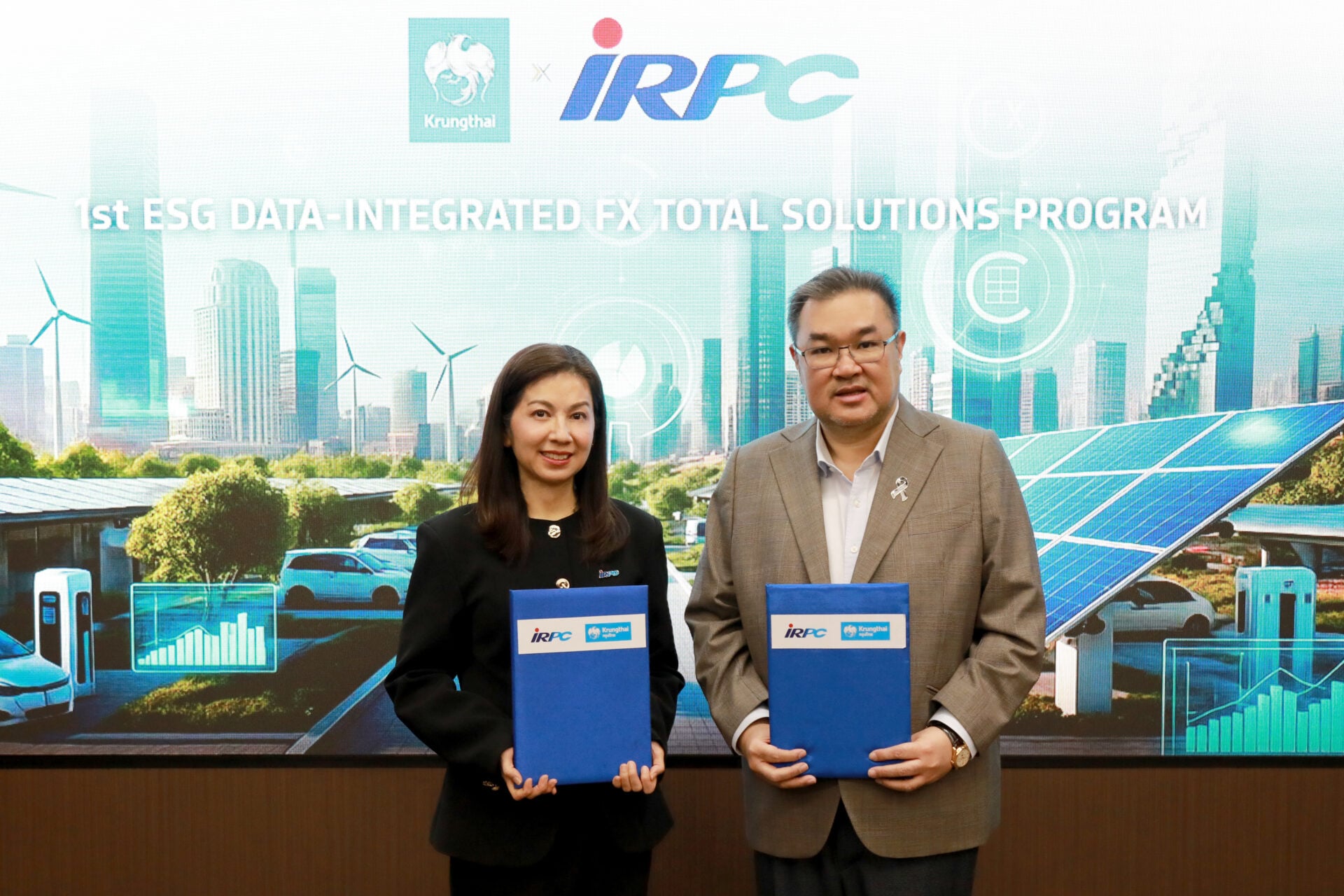 นายรวินทร์ บุญญานุสาสน์ ผู้บริหารสายงานธุรกิจตลาดเงินตลาดทุน ธนาคารกรุงไทย กล่าวว่า ธนาคารมุ่งมั่นพัฒนานวัตกรรมการเงินสนับสนุนการเติบโตอย่างยั่งยืนของภาคธุรกิจ โดยผสานความเชี่ยวชาญด้าน Solutions ทางการเงินเข้ากับแนวคิดด้านสิ่งแวดล้อม สังคม และธรรมาภิบาล (ESG) เพิ่มศักยภาพการบริหารความเสี่ยงทางการเงิน ควบคู่กับการขับเคลื่อนเป้าหมายด้านความยั่งยืนได้อย่างมีประสิทธิภาพ โดยล่าสุด ธนาคารได้ร่วมมือกับบริษัท ไออาร์พีซี จำกัด (มหาชน) (ไออาร์พีซี) บูรณาการบริหารความเสี่ยงอัตราแลกเปลี่ยนผ่านโครงการ ESG Data-Integrated FX Total Solutions ซึ่งเป็นโครงการต้นแบบในการนำข้อมูล ESG มาเชื่อมโยงกับธุรกรรมบริหารความเสี่ยง เช่น FX Forward และ Cross-Currency Swap โดยธนาคารให้คำปรึกษาเชิงลึกและออกแบบโครงสร้างธุรกรรมที่เหมาะสมกับรายได้-รายจ่ายของไออาร์พีซี พร้อมนำผลการดำเนินงานด้าน ESG มาเป็นเกณฑ์ในการรับสิทธิประโยชน์ทางการเงิน ช่วยลดต้นทุนธุรกรรมและสะท้อนการดำเนินธุรกิจ
