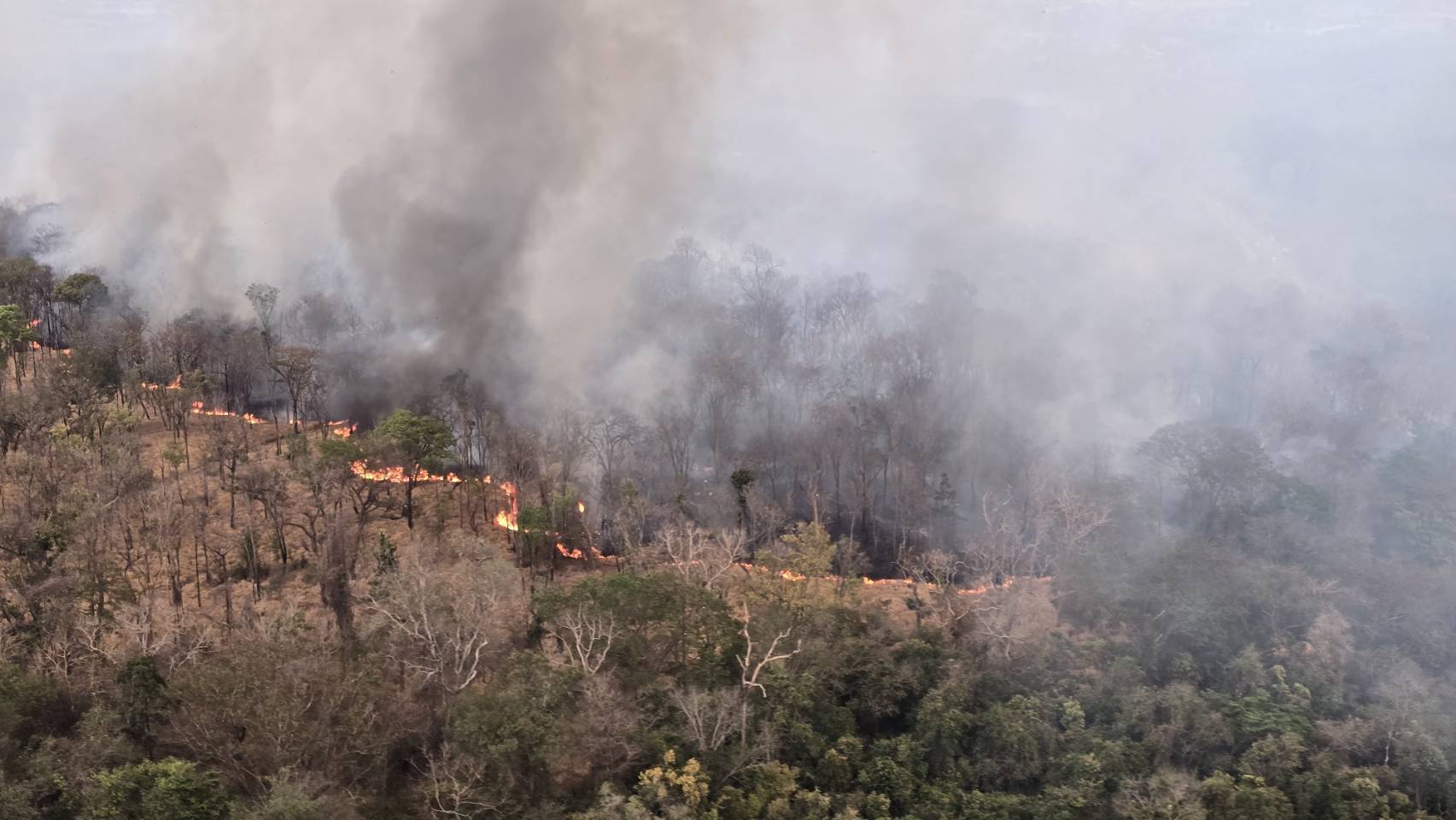 ผลการบินสำรวจพบจุดไฟป่ากำลังลุกไหม้เป็นแนวยาว พื้นที่ส่วนใหญ่เป็นป่าเต็งรัง มีเชื้อเพลิงประเภทหญ้าไผ่เพ็กสะสมจำนวนมาก ทำให้ไฟลุกลามได้รวดเร็ว จังหวัดจึงขอรับการสนับสนุนอากาศยานช่วยบินทิ้งน้ำเพื่อเร่งควบคุมเพลิง