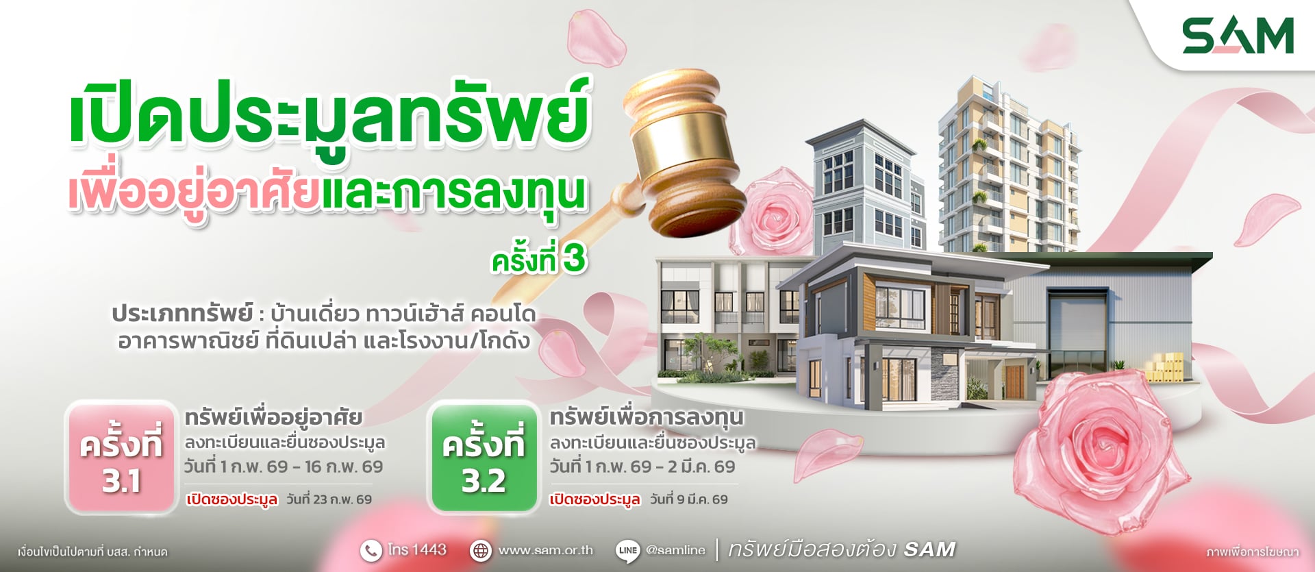 ทั้งนี้ ผู้สนใจเข้าร่วมประมูลสามารถลงทะเบียนและยื่นซองประมูล พร้อมเอกสารประกอบการประมูลที่กำหนดได้ที่สำนักงานใหญ่ SAM อาคารซันทาวเวอร์ส ถ.วิภาวดีรังสิต กรุงเทพฯ หรือสอบถามรายละเอียดเพิ่มเติมได้ที่ Call Center 1443 และดูรายละเอียดทรัพย์สินได้ทางเว็บไซต์ที่ www.sam.or.th รวมทั้งช่องทางออนไลน์ที่หลากหลายและสะดวกรวดเร็ว โดยแอด ID Line @Samline ติดตาม Facebook /YouTube / TikTok ได้ที่ "SAM บริหารสินทรัพย์สุขุมวิท" เพื่อติดตามข้อมูลข่าวสารดี ๆ จาก SAM