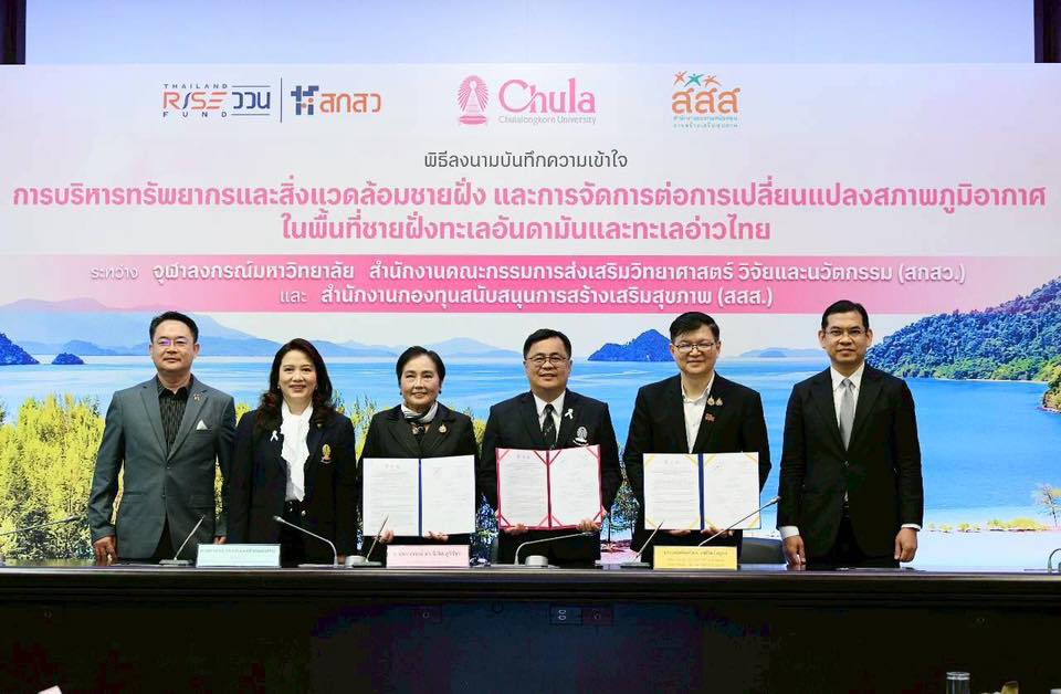 ด้วยเหตุนี้ สำนักงานกองทุนสนับสนุนการสร้างเสริมสุขภาพ (สสส.) สำนักงานคณะกรรมการส่งเสริมวิทยาศาสตร์ วิจัยและนวัตกรรม (สกสว.) และจุฬาลงกรณ์มหาวิทยาลัย จึงผนึกกำลังลงนามบันทึกข้อตกลงความร่วมมือ เพื่อสนับสนุนการบริหารจัดการทรัพยากรและสิ่งแวดล้อมชายฝั่ง และรับมือการเปลี่ยนแปลงสภาพภูมิอากาศในพื้นที่ชายฝั่งทะเลอันดามันและอ่าวไทย ภายใต้แนวคิดการพัฒนาเชิงพื้นที่ (Area-Based Development) และเป้าหมายการพัฒนาอย่างยั่งยืน (SDGs)