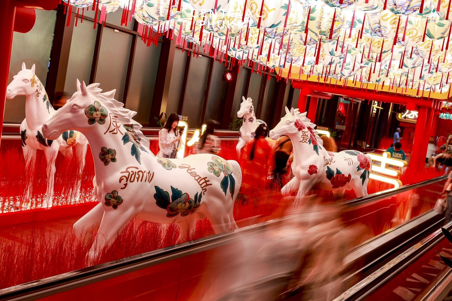 - เซ็นทรัล ภูเก็ต: ‘The Golden Horse Sculpture’ ประติมากรรมม้าเทียนหม่าลวดลายดอกไม้มงคล ที่สะท้อนถึงความสง่างามและความรุ่งเรือง ในอุโมงที่ประดับด้วยโคมไฟนับร้อย ส่องประกายสว่างไสว พร้อมคำอวยพรต่าง ๆ มอบเป็นพลังบวกให้ทุกคน