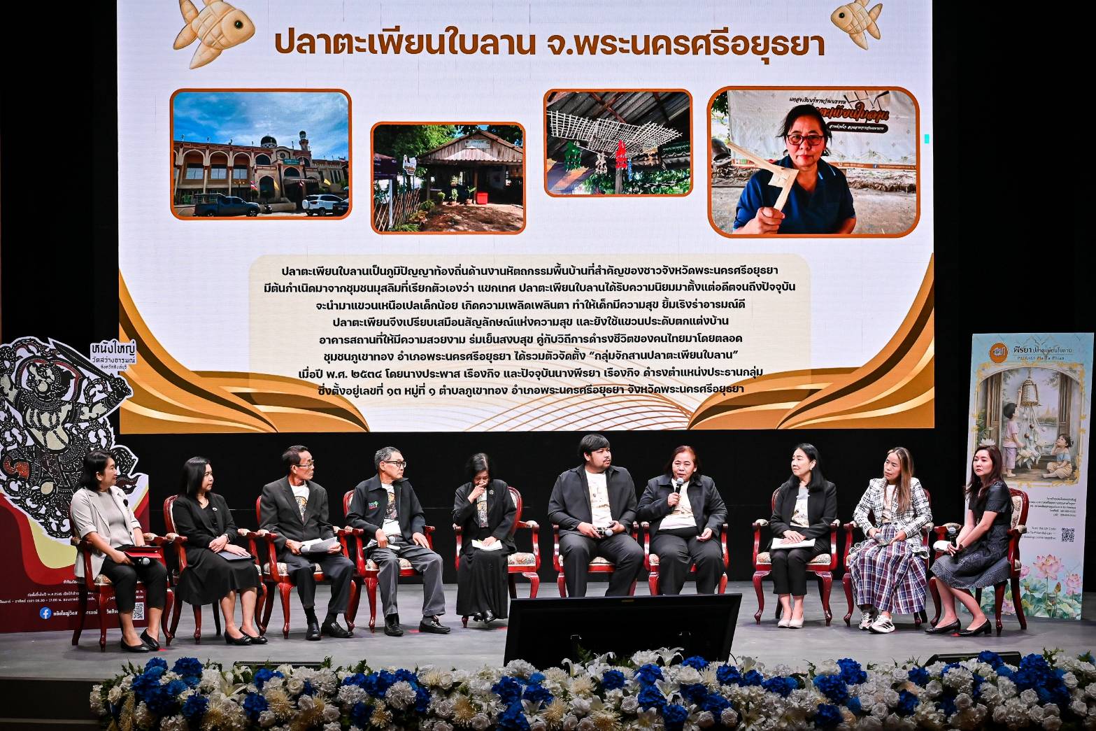 ช่วงที่ 3 “สร้างแบรนด์และยกระดับมาตรฐาน” โดย (๑) ผู้ช่วยศาตราจารย์ ดร. ศิวลาภ สุขไพบูลย์วัฒน์ รองผู้อำนวยการฝ่ายบริหาร สถาบันยุทธศาสตร์ทางปัญญาและวิจัย มหาวิทยาลัยศรีนครินทรวิโรฒ รศ.ดร. ชวัลลักษณ์ คุณาธิกรกิจ ผู้เชี่ยวชาญด้านแบบจาลองธุรกิจ อาจารย์ประจำคณะบริหารธุรกิจเพื่อสังคม มหาวิทยาลัยศรีนครินทรวิโรฒ อาจารย์ ดร. พรนารี ชัยดิเรก ผู้เชี่ยวชาญด้านการออกแบบ อาจารย์ประจำคณะศิลปกรรมศาสตร์ มหาวิทยาลัยศรีนครินทรวิโรฒ ผู้แทนชุมชนหนังใหญ่วัดสว่างอารมณ์ จังหวัดสิงห์บุรี และผู้แทนจากกลุ่มจักสานปลาตะเพียนใบลาน จังหวัดพระนครศรีอยุธยา
