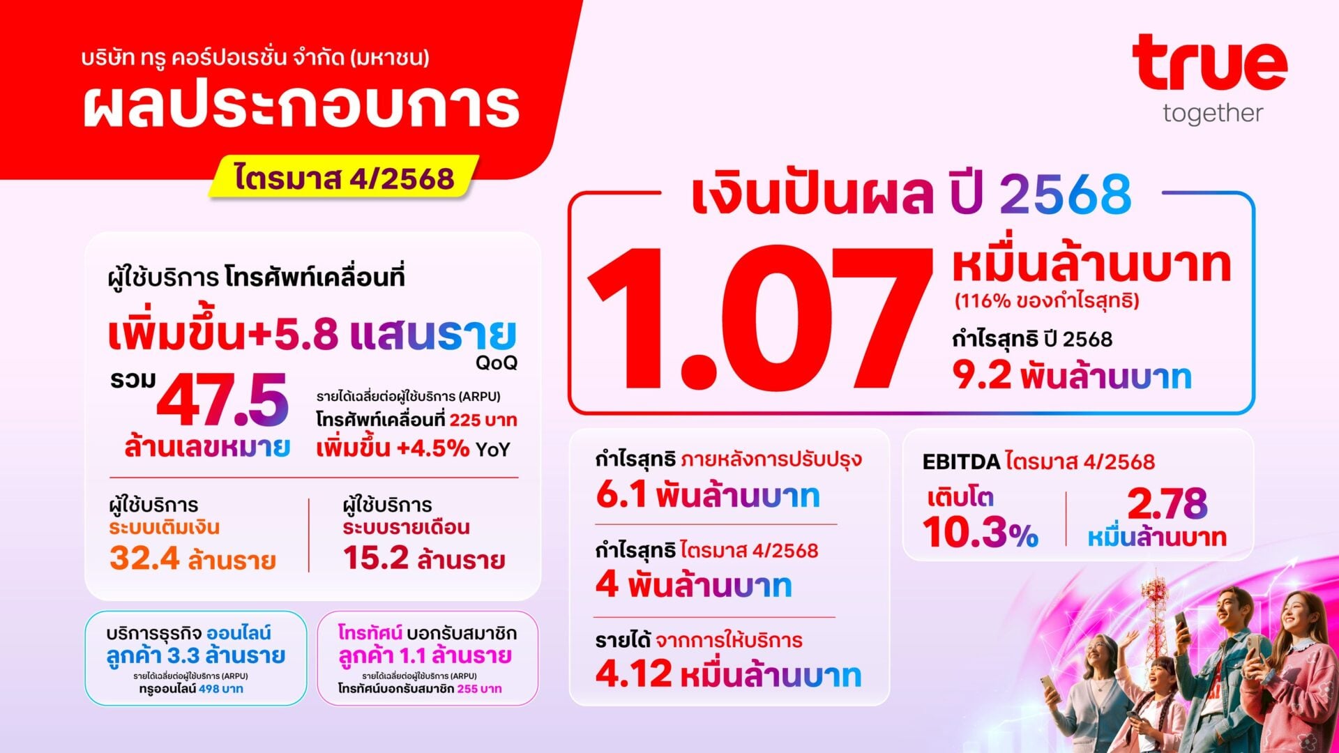 19 กุมภาพันธ์ 2569 – บริษัท ทรู คอร์ปอเรชั่น จำกัด (มหาชน) ประกาศผลการดำเนินงานประจำไตรมาส 4/2568 โดยสามารถทำกำไรสุทธิได้ต่อเนื่องเป็นไตรมาสที่ 4 ติดต่อกัน บริษัทฯ รายงานผลกำไรสุทธิหลังหักภาษีจำนวน 4 พันล้านบาท และกำไรสุทธิหลังปรับปรุงรายการพิเศษ (Normalized Profit) จำนวน 6.1 พันล้านบาท สำหรับ EBITDA ในไตรมาสนี้อยู่ที่ 2.78 หมื่นล้านบาท สะท้อนผลประโยชน์เต็มไตรมาสจากการได้ใบอนุญาตคลื่นความถี่ ทั้งนี้ คณะกรรมการบริษัทฯ มีมติเสนอจ่ายเงินปันผลประจำปีจำนวน 4.1 พันล้านบาท ส่งผลให้เงินปันผลรวมทั้งปีอยู่ที่ 1.07 หมื่นล้านบาท คิดเป็นอัตราการจ่ายเงินปันผล 116% ของ NPAT ตามรายงาน และ 56% ของ NPAT หลังปรับปรุงรายการพิเศษ