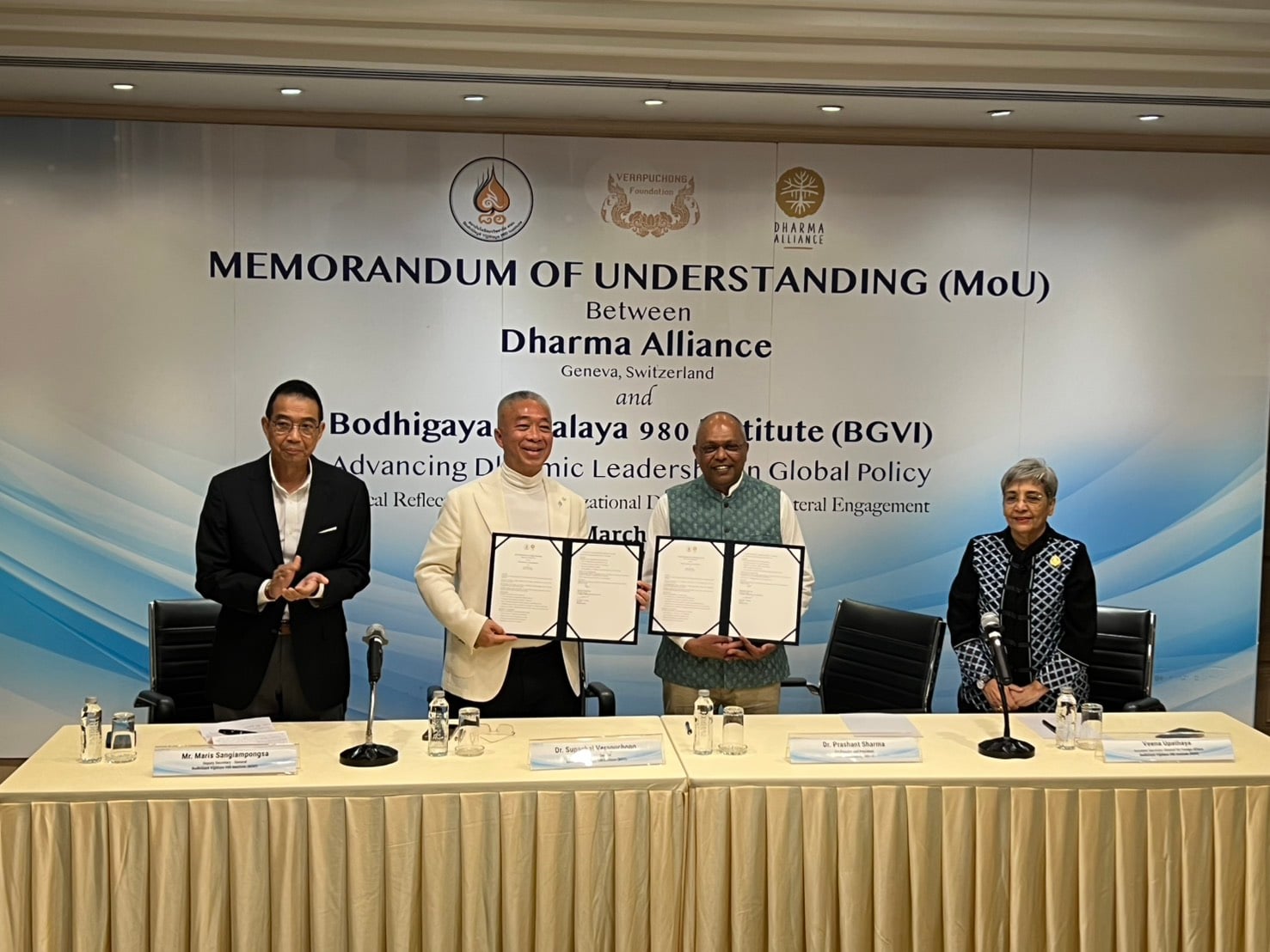 เมื่อวันที่ 9 มีนาคม 2569 เวลา 09.30 น. ดร.สุภชัย วีระภุชงค์ เลขาธิการสถาบันโพธิคยาวิชชาลัย 980 (BGVI) องค์กรประเทศไทย และ ดร.ปราสัน ชาร์มา ประธานองค์กรพันธมิตรธรรมะ (Dharma Alliance) นครเจนีวา ประเทศสวิตเซอร์แลนด์ ที่ทำงานใกล้ชิดกับองค์การสหประชาชาติ ได้ร่วมลงนามบันทึกความเข้าใจว่าด้วย “กรอบความร่วมมือ” เดินหน้าเสริมสร้างธรรมะและจริยธรรม ในมิติส่งเสริมสันติภาพบนสังคมโลก ที่ห้องประชุม บริษัท ไทยนครพัฒนา จำกัด จ.นนทบุรี โดยมีนายมาริษ เสงี่ยมพงษ์ อดีต รมว.ต่างประเทศ และรองเลขาธิการสถาบันโพธิคยาิชชาลัย 80 และ ดร.วีณา อุปัทยา ผู้ช่วยเลขาธิการฝ่ายต่างประเทศ สถาบันโพธิคยาวิชชาลัย 980 ร่วมลงนามเป็นสักขีพยาน