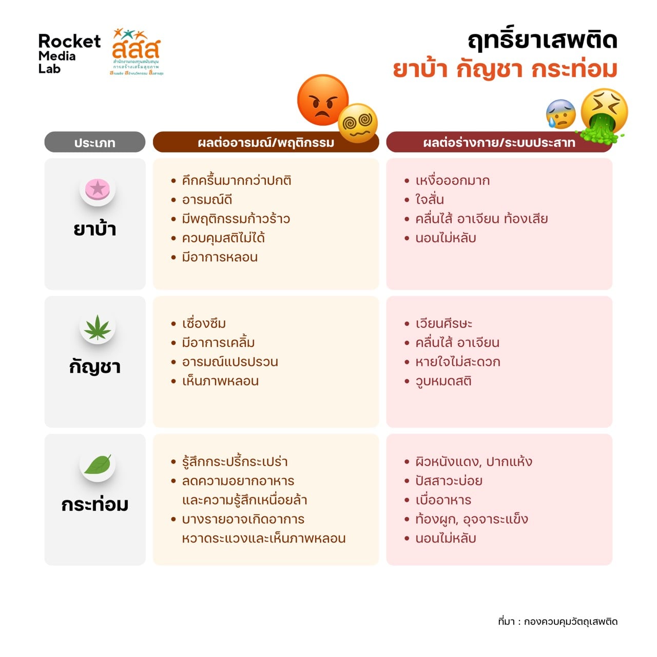 “สสส. จึงร่วมกับ บริษัท ร็อกเกต มีเดีย แล็บ จำกัด (Rocket Media Lab) จัดทำรายงานสถานการณ์เด่นทางสุขภาพ ประจำไตรมาส 4 ปี 2568 ตอน ‘ยาบ้า กัญชา กระท่อม วังวนของเยาวชนกับปัญหายาเสพติด’ เพื่อสะท้อนปัญหาที่เกี่ยวข้องหลังพบสถิติที่น่ากังวลจากจำนวนคดียาเสพติดที่แม้ภาพรวมระหว่างปี 2565-2566 จะลดลงแต่สัดส่วนคดีที่เกิดจากการเสพกลับพุ่งสูง 77.44% เมื่อเทียบกับคดีครอบครองหรืออื่นๆ ซึ่ง สสส. ให้ความสำคัญกับการขับเคลื่อนงานสร้างเสริมสุขภาพ เพื่อลดผลกระทบจากปัญหาสารเสพติดมาอย่างต่อเนื่อง และเป็น 1 ใน 16 หน่วยงานภาคีที่ร่วมผลักดันพื้นที่ต้นแบบ โดยเฉพาะการขยายผลโมเดล ชุมชนล้อมรักษ์ (CBTx) เพื่อเพิ่มประสิทธิภาพในการเข้าถึงการบำบัดรักษาในกลุ่มผู้ป่วยจิตเวชที่มีความเสี่ยงสูง ควบคู่ไปกับการสนับสนุนองค์ความรู้และนวัตกรรมเพื่อสร้างพื้นที่ปลอดภัยสู่การเป็นชุมชนสุขภาวะ โดยปัจจุบันมีพื้นที่ต้นแบบที่ปลอดภัยจากยาเสพติดแล้ว 29 พื้นที่ทั่วประเทศ ทั้งนี้ สำหรับผู้บริหารสถานศึกษา ครู และผู้ปกครองที่สนใจ สามารถศึกษาข้อมูลและดาวน์โหลดชุดความรู้ได้ที่ https://resourcecenter.thaihealth.or.th/” นางสาวรุ่งอรุณ กล่าว