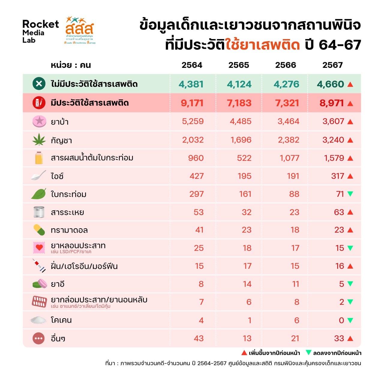 นายสันติชัย อาภรณ์ศรี บรรณาธิการบริหาร Rocket Media Lab กล่าวว่า จากการรวบรวมและวิเคราะห์ข้อมูลสถานการณ์ที่เกิดขึ้น พบพฤติกรรมและปัจจัยการเข้าถึงยาเสพติดของเยาวชนใน 3 มิติ ได้แก่ 1.การเปลี่ยนแปลงพฤติกรรมการใช้ยาเสพติดหลังการปลดล็อกพืชเสพติด ที่ยาบ้ายังเป็นสารหลักที่มีผู้ใช้สูงสุด แต่เยาวชนที่ใช้กัญชาและกระท่อมก็เพิ่มสูงขึ้นอย่างก้าวกระโดด โดยปี 2567 พบเยาวชนใช้กัญชาเพิ่มขึ้น 3,240 คน และใช้น้ำต้มใบกระท่อม 1,579 คน อีกทั้งยังผสมสารเคมีอันตรายตามความเชื่อผิดๆ เพื่อเพิ่มฤทธิ์มึนเมา 2.นวัตกรรมการซื้อขายและสถานที่มั่วสุม ตลาดออนไลน์กลายเป็นช่องทางหลัก โดยเฉพาะบนแพลตฟอร์ม X ที่พบการประกาศขายมากที่สุด 68% มีการใช้สัญลักษณ์อิโมจิแทนชื่อยาเพื่อหลบเลี่ยงระบบตรวจสอบ ขณะที่พฤติกรรมการมั่วสุมเปลี่ยนจากพื้นที่สาธารณะเป็นพื้นที่ส่วนตัว เช่น ห้องพัก พูลวิลล่าหรือรีสอร์ต เพื่อเลี่ยงการจับกุม 3.วิกฤตขีดความสามารถด้านการบำบัด ที่พบว่ายอดผู้เข้าบำบัดปี 2568 คาดว่าจะสูงถึง 260,000 คน ซึ่งเกินศักยภาพที่ระบบสาธารณสุขจะรองรับได้ ยิ่งไปกว่านั้นไทยยังขาดแคลนบุคลากรจิตแพทย์เฉพาะทางด้านการเสพติด นี่จึงเป็นโจทย์สำคัญที่ทุกภาคส่วนต้องร่วมกันแก้ปัญหาเพื่อคืนเยาวชนให้กลับสู่สังคมอย่างมีคุณภาพ
